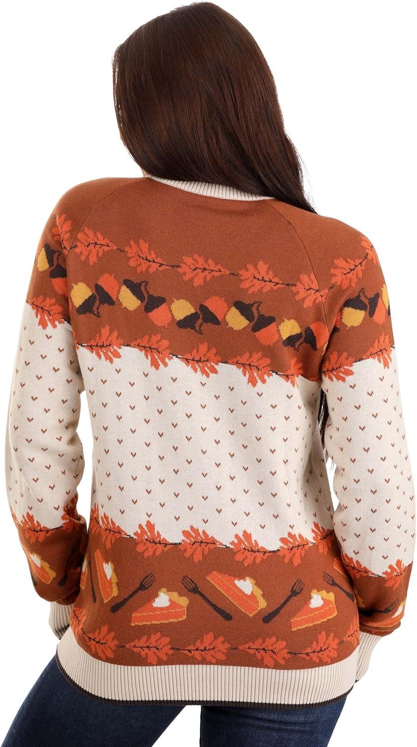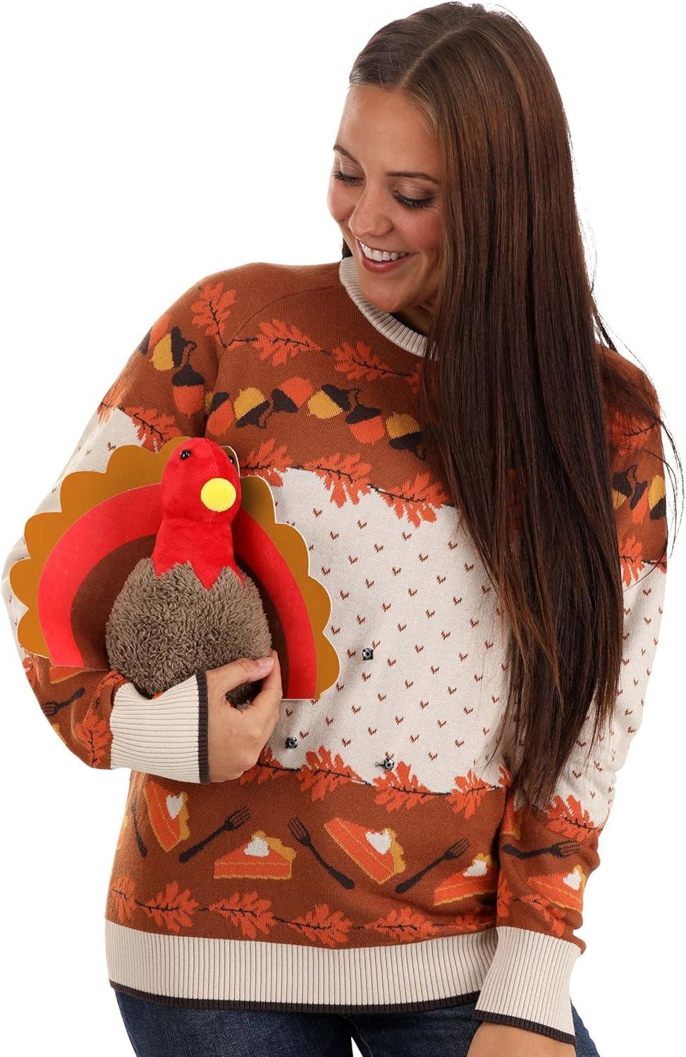 Your favorite holiday is about to be even better when you get our 3D Turkey Ugly Holiday Sweater for adults! As expert costume crafters we wanted to offer great seasonal apparel, too, so we developed and launched our own line of Halloween and Christmas sweaters with hilariously ugly designs and fan favorite characters. Now we're adding Turkey Day to the lineup with this amazing 3D Turkey Thanksgiving Sweater! The knit sweater features a design with pumpkin pie slices, acorns, and autumn leaves. What really brings this sweater to life is the plush character. The sweater includes a soft-sculpted turkey that attaches to the front with a set of metal snaps. With rib knit cuffs, collar, and waistband and a unisex fit this adult sweater is ready for delicious fun this Thanksgiving!