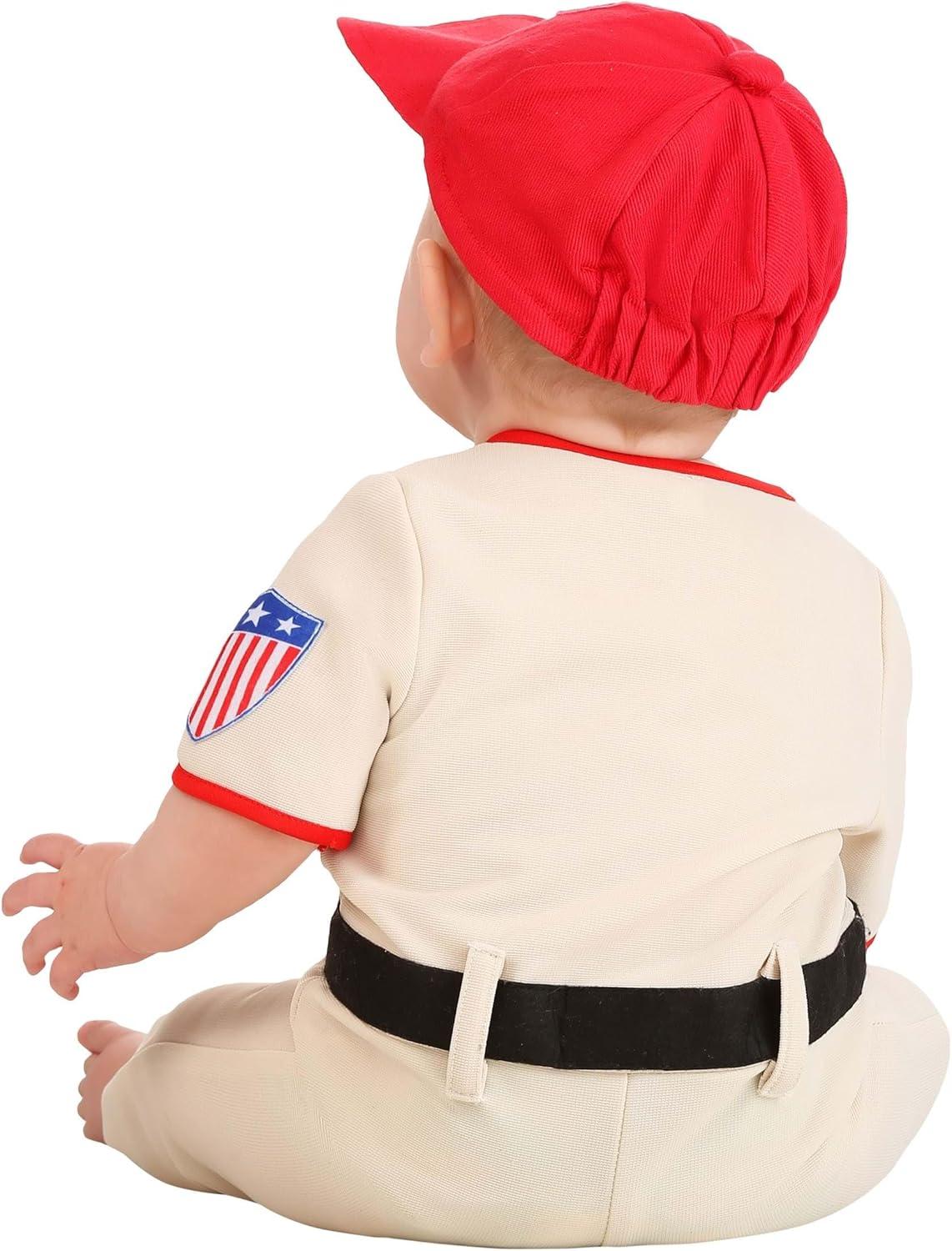 The Fun Costumes A League of Their Own Coach Jimmy Infant Costume A League of Their Own, the 1992 film, has become a modern classic! The movie follows Dottie Hinson and Coach Jimmy Dugan as they carve out a niche for female baseball players in the 1940s. We've teamed up with A League of Their Own to create fun costumes based on your favorite characters. This Coach Jimmy Infant Costume has an authentic look that will instantly transform your child into the leader of the team. Product Design: It's time for a new coach to take over the Rockford Peaches! Throw your little one's name in the hat with this League of Their Own Infant Coach Jimmy Costume. The tan-colored onesie has red piping, which makes it resemble a vintage baseball uniform. It also comes with embroidered patches on the sleeve and chest, making it a home run for any fan of the classic movie. It even comes with a bright red baseball that has the Rockford Peaches “R” on the front. Your little one will be ready to coach the team when they wriggle into this adorable outfit. Product Details: 100% polyester materials Jumpsuit designed to look like a classic baseball uniform Jumpsuit has snap button closure on the front A League of Their Own emblem embroidered onto front American flag shield patch embroidered onto sleeve Snap button closure on the seam for easy diaper access Red baseball hat has red “R” on the front Hat comes with elastic band in back for a snug fit Officially licensed Size Chart: 0/3 Months: Chest=20″; Torso=12 1/2″; Jumpsuit Length=18 1/2″ 6/9 Months: Chest=21 1/2″; Torso=14 1/2″; Jumpsuit Length=22 1/2″ 12/18 Months: Chest=22 3/4″; Torso=16 1/2″; Jumpsuit Length=26 1/4″ About Us: Fun Costumes are exclusively Made By Us and begin with passion, teamwork, and industry expertise decades in the making. Our products are proof that with the right people even a simple idea can grow into something incredible. We started in a small garage in Minnesota, providing costumes to our local community, and now we're creating costumes for people all around the world. There's no crying in baseball!