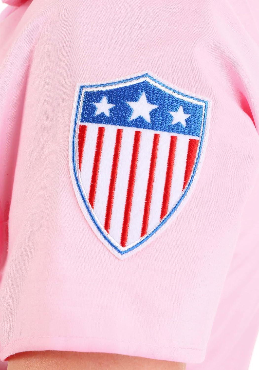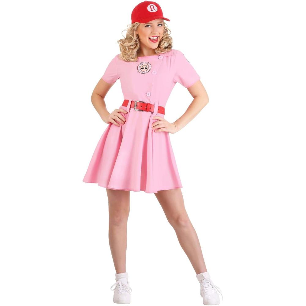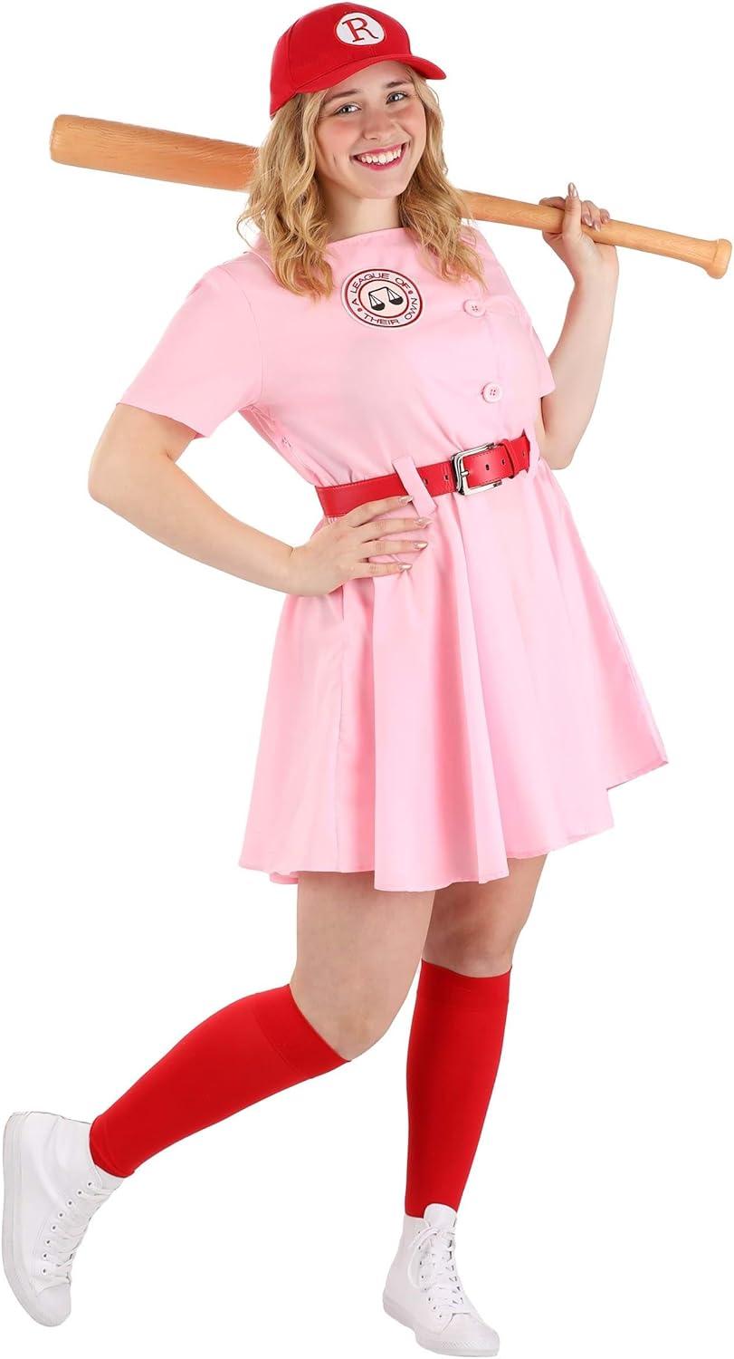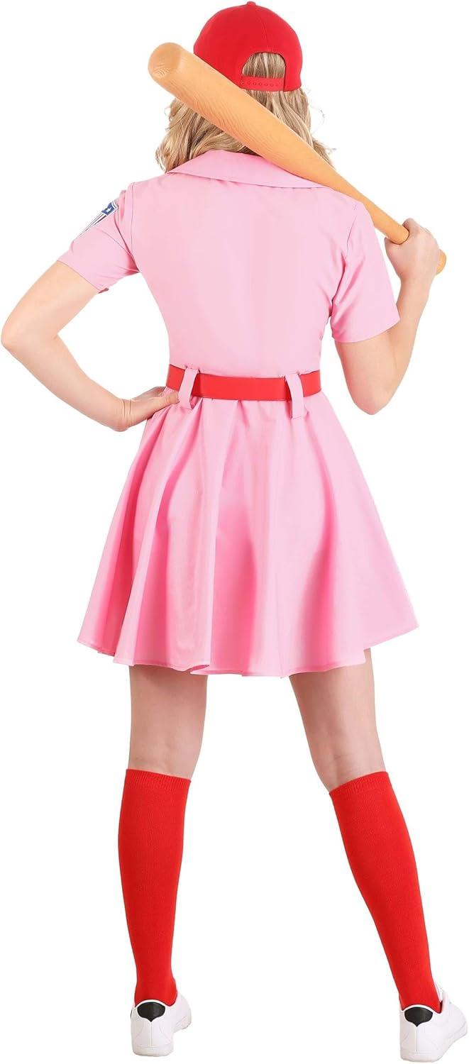 Women's A League of Their Own Dottie Costume Get ready to play ball and look good doing it. This exclusive A League of Their Own Costume is just the thing to get you in the baseball spirit. We crafted this costume in our own Made by Us studios, and we teamed up with Columbia Pictures so that it's an officially licensed replica baseball uniform from film. With the included accessories and attention to detail, you’ll have everything you need to become a Rockford Peach! Product Design: With our officially licensed A League of Their Own Costume, you can get ready to hit homers and run the bases at the big game. This Made by Us Rockford Peaches Uniform is made with a lightweight cotton blend that looks stylish and performs well in hot or cool weather. The red vinyl belt and embroidered patches make this uniform look polished and ready for a little baseball publicity. You’ll be ready to catch pop flies with your Rockford baseball cap and slide home, like Mae, in your matching knee-high socks. Product Details: 100% polyester dress: Short-sleeved dress has off-center front buttons, belt loops at waist Zipper down side seam of the dress Embroidered patches sewn to bodice front & left sleeve Baseball cap has snap back size adjustment band, embroidered “R” on the front Red vinyl belt has silver-tone metal buckle Size Chart: S: Chest=38″; Waist=31″, Dress Length=33 1/2″ M: Chest=40″; Waist=32 1/2″, Dress Length=34″ L: Chest=42″; Waist=37″, Dress Length=35″ XL: Chest=45″; Waist=40″, Dress Length=36″ About Us: Fun Costumes are exclusively Made by Us and begin with passion, teamwork, and industry expertise decades in the making. Our products are proof that with the right people even a simple idea can grow into something incredible. We started in a small garage in Minnesota, providing costumes to our local community, and now we're creating costumes for people all around the world. Get this A League of Their Own Baseball Costume for Women to hit a home run this Halloween! – Dress –