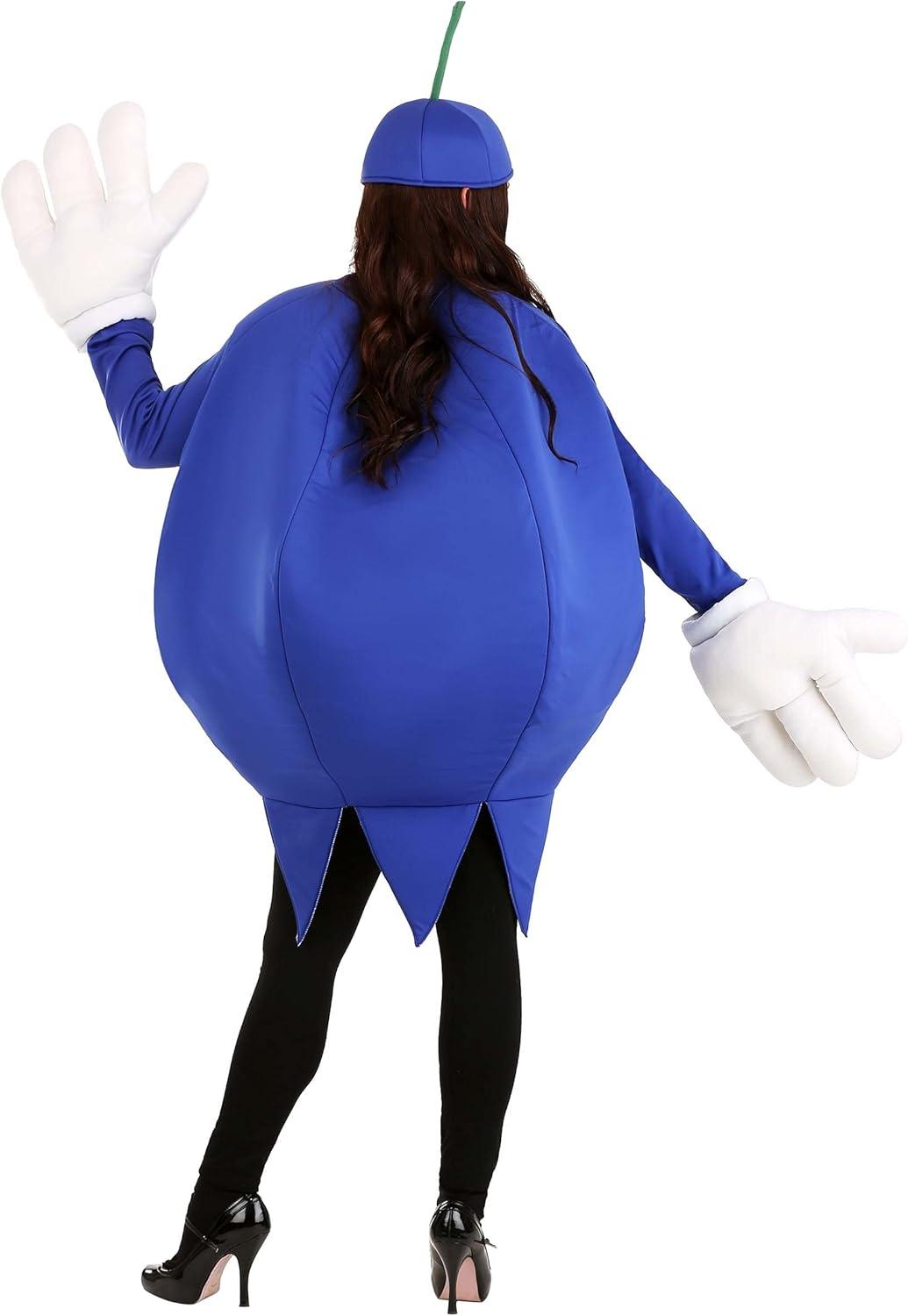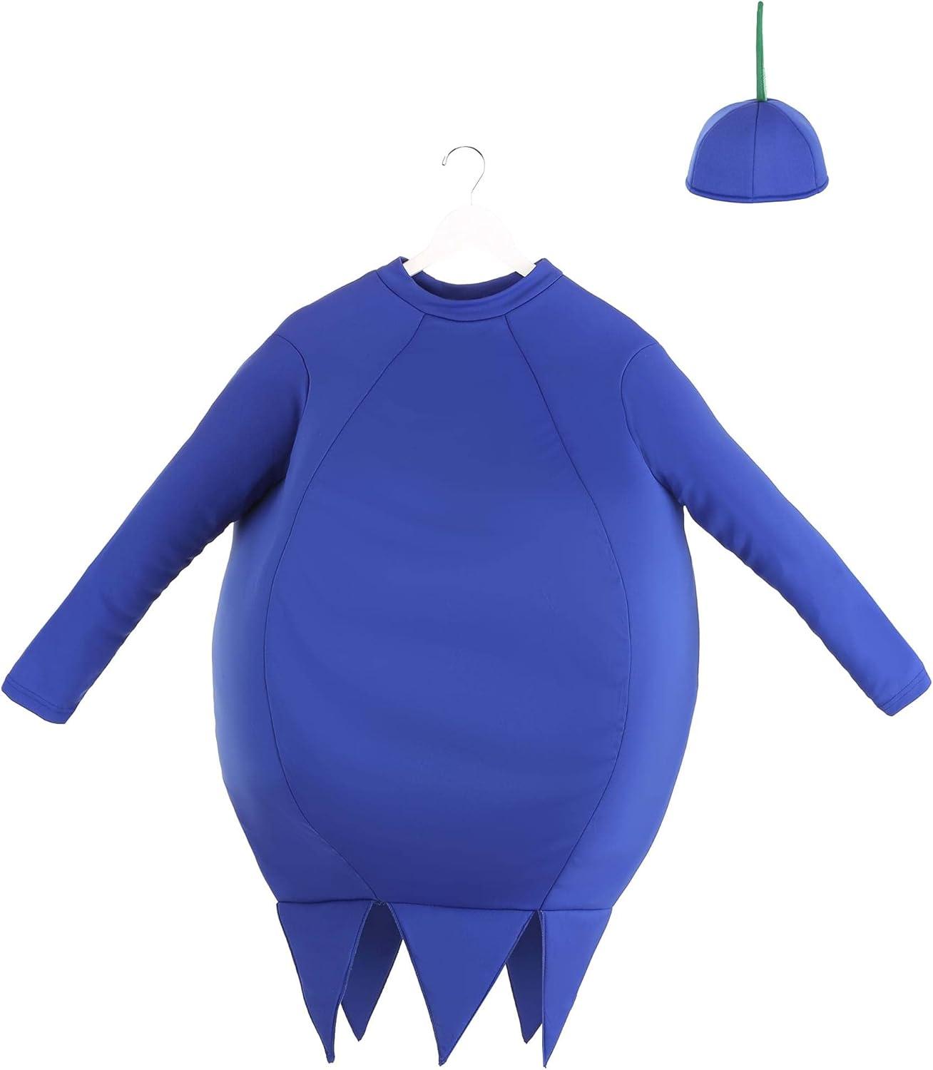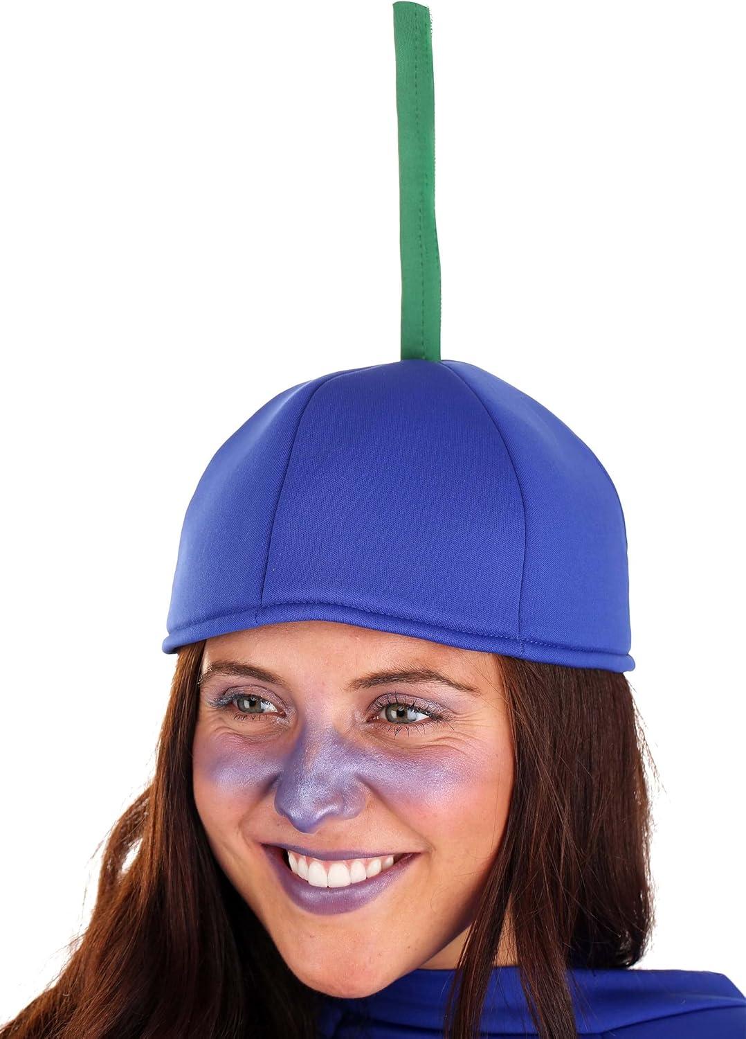 Adult Blueberry Costume – Tunic, Hat, Foam Body, Jagged Hemline – Skullcap with Green Stem Standard Bundle