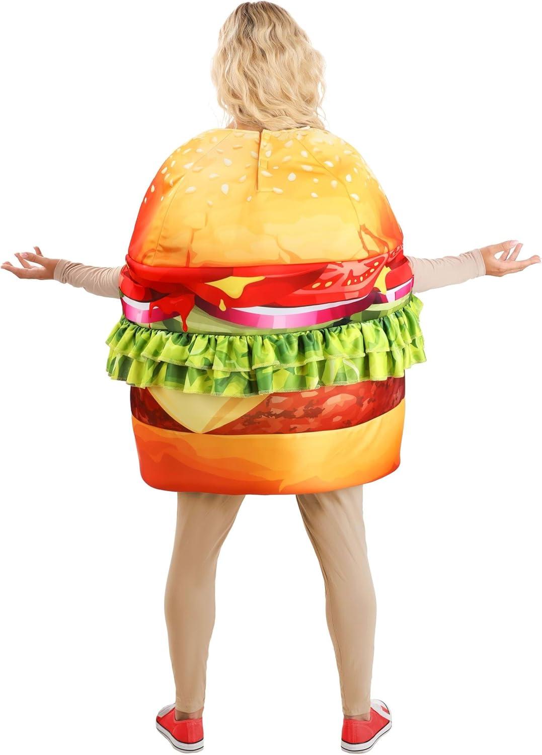 Serve up laughs and take a big bite out of costume fun with our Adult Deluxe Hamburger Costume! Whether you're headed to a Halloween bash, promoting your food truck, or entering a quirky costume contest, this juicy outfit delivers full-flavor fun. Designed to transform you into the most delicious person in the room, this larger-than-life burger costume includes everything you need to steal the spotlight—and maybe a few cravings. The costume features a generously padded foam-backed tunic made from soft jersey fabric. Printed details bring every savory layer to life, from the sesame seed bun to the lettuce, tomato, cheese, and burger patty—all in vibrant color. It’s a visual feast that’s sure to turn heads and spark laughter wherever you go. Comfort and ease-of-use are baked into the design. The tunic secures with a hook and loop fastener at the back and easily fits over everyday clothes. Whether you're walking in a parade, dancing at a party, or grilling at a BBQ, the costume is breathable and flexible enough to move with you. What truly sets this costume apart is the included plastic tubing, which runs through the top and bottom edges of the tunic. This smart design element gives the costume its signature burger shape and helps it hold structure throughout the day or night, so your look stays fresh from start to finish. Made By Us and built with durable 100% polyester materials, this exclusive hamburger costume is perfect for food lovers, pun enthusiasts, and anyone who loves a good novelty costume. It’s ideal for Halloween, themed fundraisers, restaurant openings, or even viral TikTok and Instagram content. Dress up solo or team up with friends wearing fries, soda, or hot dog costumes to become a full fast-food squad! – Tunic – 2 Plastic Tubes
