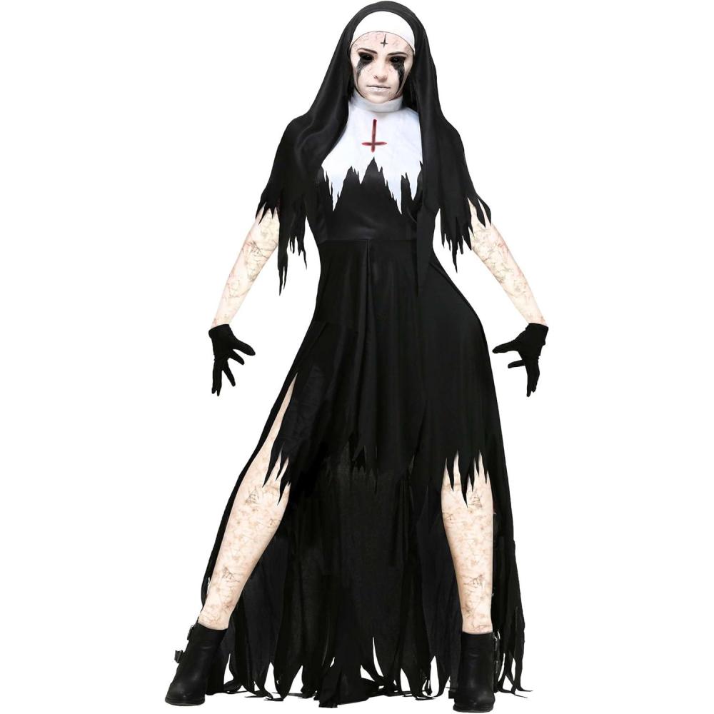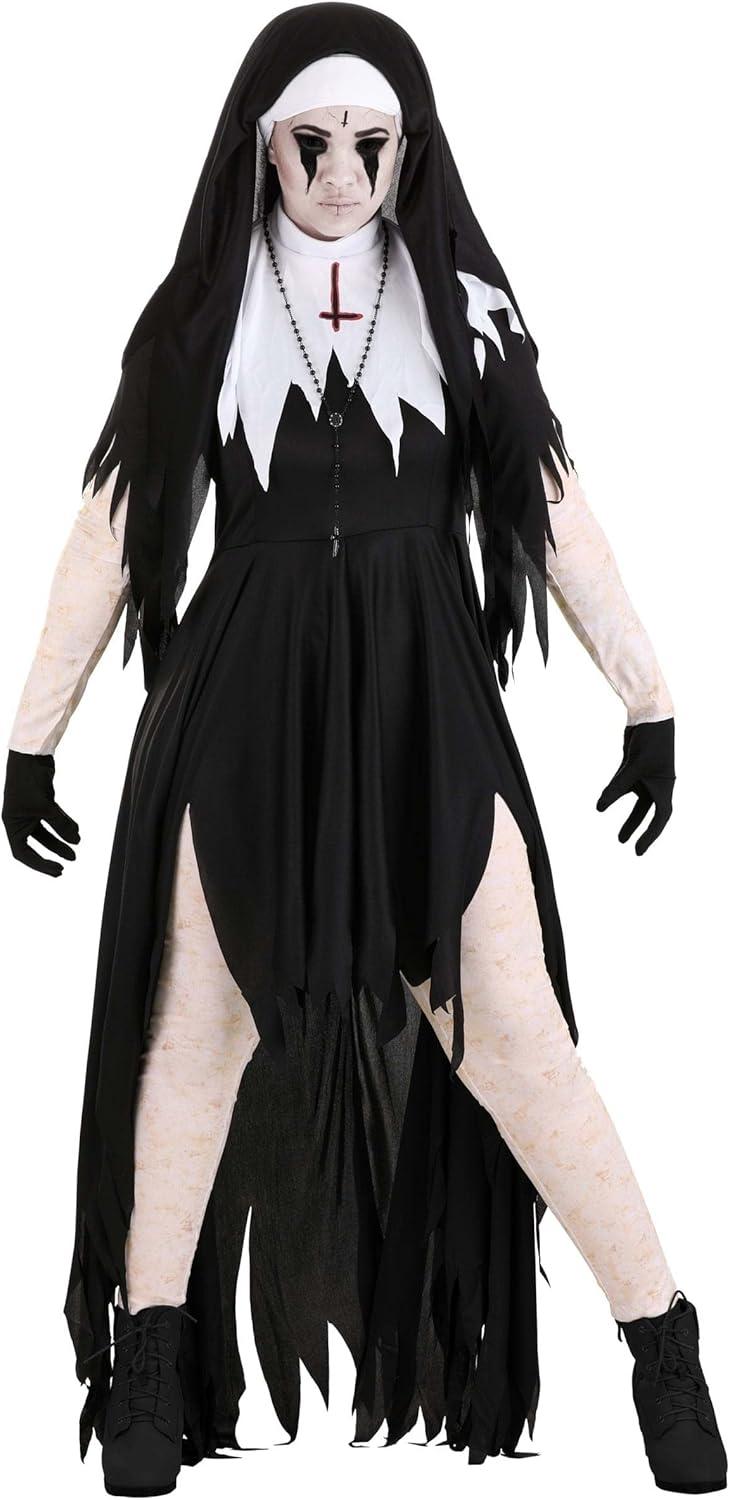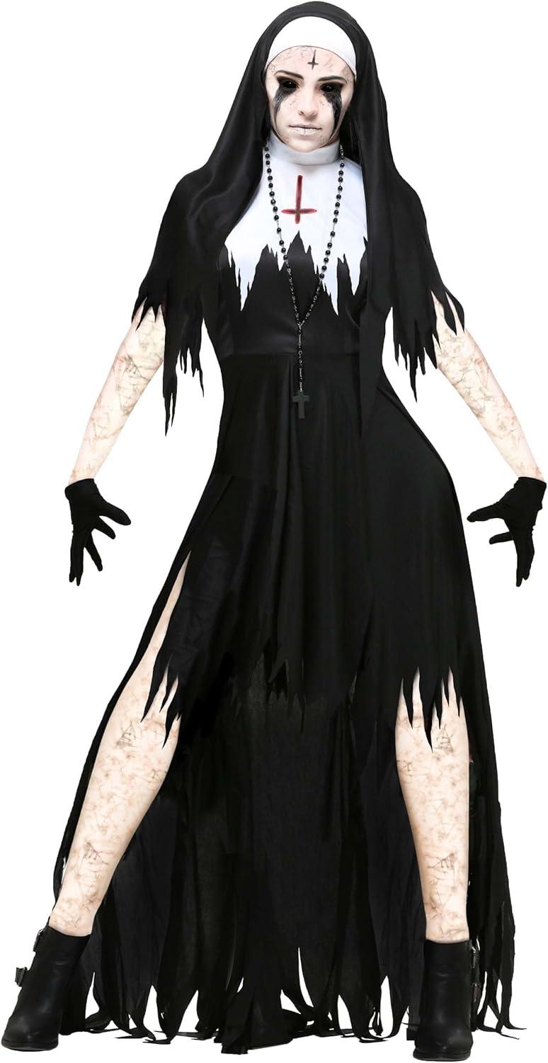 Adult Dreadful Nun Costume Women’s, Undead Sister Mary Catherine Costume, Black Scary Exorcist Halloween Outfit