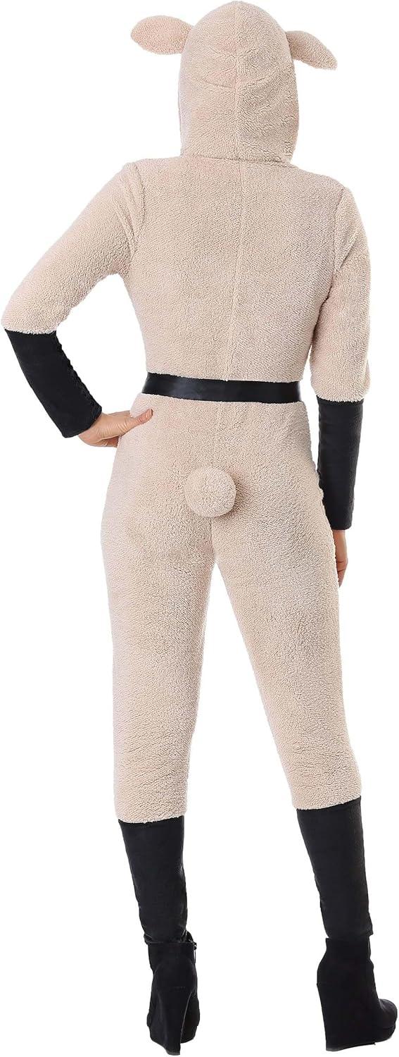 All eyes will surely be on ewe when you show up to a costume party in this Adult Female Sheep Costume! This is a cozy look comprised of a fleecy tan jumpsuit with a black ribbon belt and a hood with ears. Black panels on the arms and legs add contrast and authenticity. So graze the party's buffet or leap onto the dance floor, you look farm-chic!