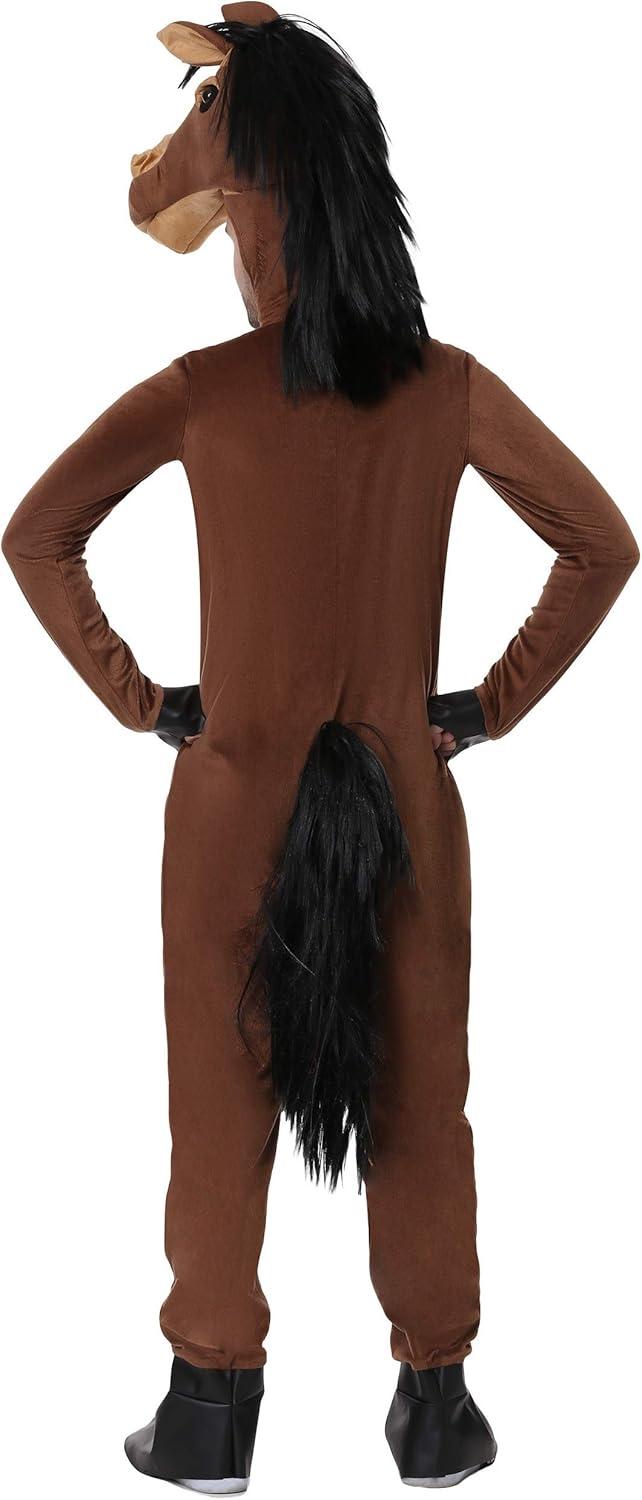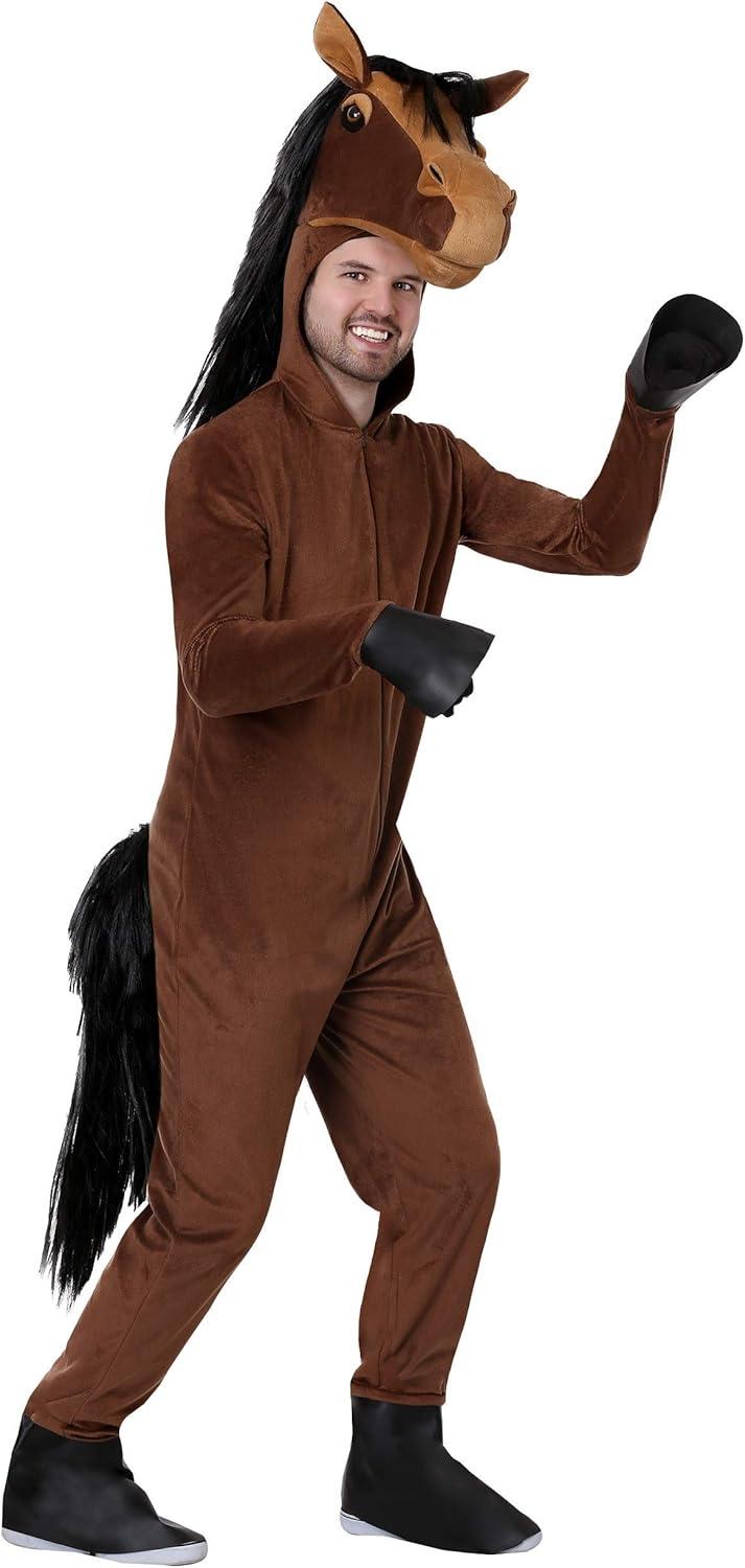 The Fun Costumes Happy Horse Costume for Adults Want to get in touch with your wild side? This horse costume for men and women will have you feeling like a galloping steed! This fun and comfortable costume has an all in one hooded jumpsuit design, with soft velour for a short furry texture. The jumpsuit zips up the front, and the horse head topped features soft-sculpted details with gentle eyes, perky ears, and a shaggy mane that matches the beautiful tale. The pants legs and sleeves are cuffed with glossy hooves to complete the look. Product Details: 100% polyester velour, faux leather, & fiberfill Jumpsuit has front zipper Hood has stuffed horse head above inner hood Horse head has soft-sculpted nose & ears, plastic eyes Synthetic hair mane on top & back of horse head Synthetic hair tail sewn to back of jumpsuit Sleeve cuffs end as faux leather “hooves” Attached hoof-shaped faux leather shoe covers have elastic bands under foot Size Chart: S: Chest=42″; Sleeve Length=25″; Torso=34″; Inseam=26″; Jumpsuit Length=60″ M: Chest=44″; Sleeve Length=25″; Torso=35″; Inseam=26″; Jumpsuit Length=60″ L: Chest=46″; Sleeve Length=25″; Torso=36 1/2″; Inseam=26″; Jumpsuit Length=60″ XL: Chest=50″; Sleeve Length=26″; Torso=37″; Inseam=25″; Jumpsuit Length=61″ About Us: Fun Costumes are exclusively made by us and begin with passion, teamwork, and industry expertise decades in the making. Our products are proof that with the right people even a simple idea can grow into something incredible. We started in a small garage in Minnesota, providing costumes to our local community, and now we’re creating costumes for people all around the world. – Hooded Jumpsuit