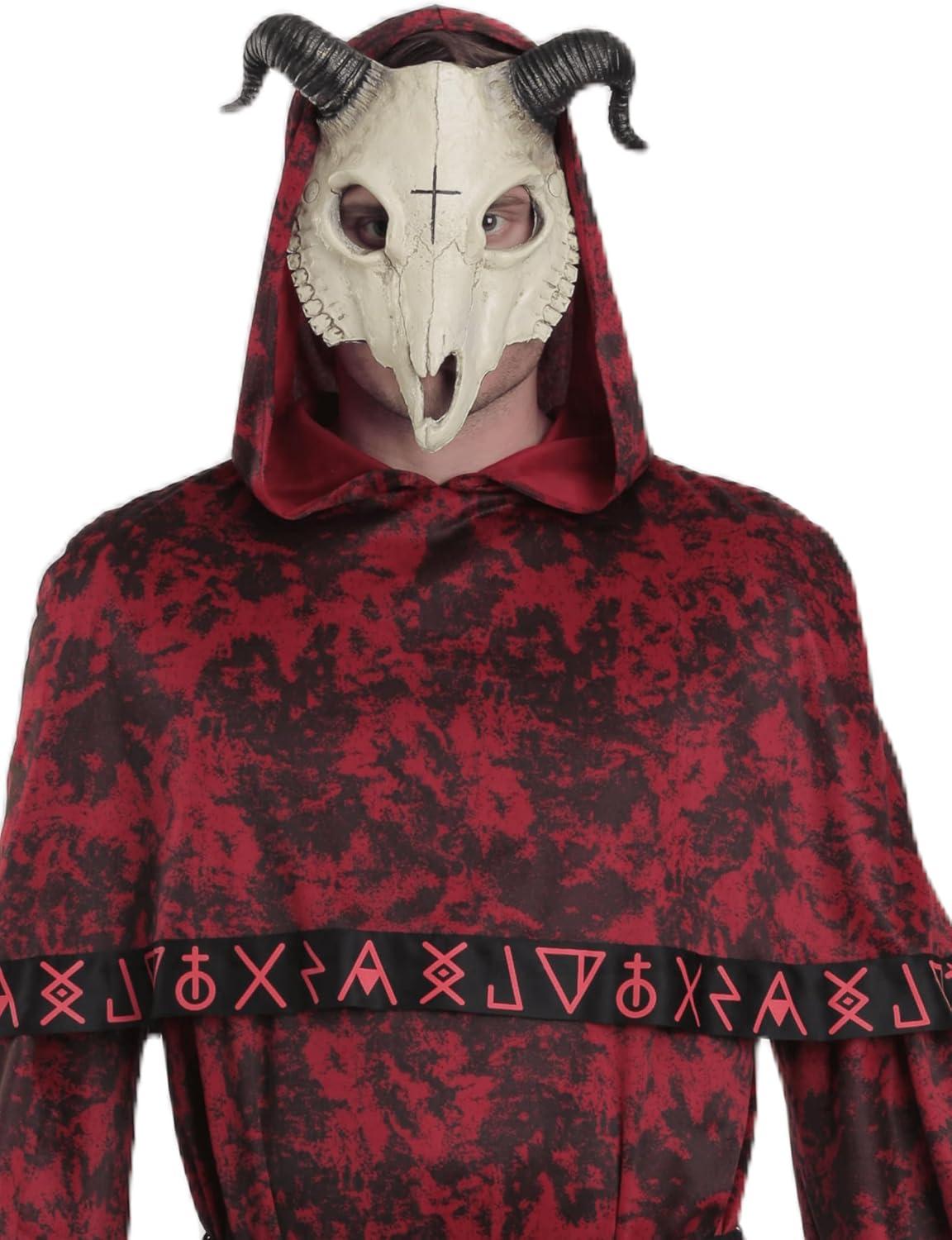 Unleash your darkest side this Halloween with the Adult Evil Skull Demon Costume, designed to bring your most sinister nightmares to life. This terrifying ensemble combines the ominous aura of ancient rituals with the spine-chilling presence of a demonic occult leader. The black hooded robe, complete with an attached capelet, gives you an air of mysterious authority, perfect for leading your cult or summoning forces beyond this world. The tie rope belt allows for a customizable fit, cinching the costume together while adding an extra layer of shadowy flair to your look. The standout feature of this evil costume is the unsettling foam mask, which features a horrifying ram skull design. With its sinister, horned appearance and detailed craftsmanship, this mask adds a truly demonic touch to the Evil Cultist Leader Robe outfit. The elastic band ensures a secure and comfortable fit, allowing you to move through the night unrecognizable, whether you're lurking in the shadows or leading a secret society underground. Perfect for Halloween, haunted house performances, or themed events, this goat skull mask will hide your true identity and let the darkness within shine through. Crafted from 100% polyester, this lightweight fabric ensures ease of movement, making it ideal for wear during Halloween parties or eerie occult gatherings. Whether you're portraying a demon, an evil occultist, or a dark arts practitioner, this Adult Masked Cultist Costume will make a lasting impression and send shivers down the spines of anyone who dares to cross your path. – Mask – Hooded Robe – Belt