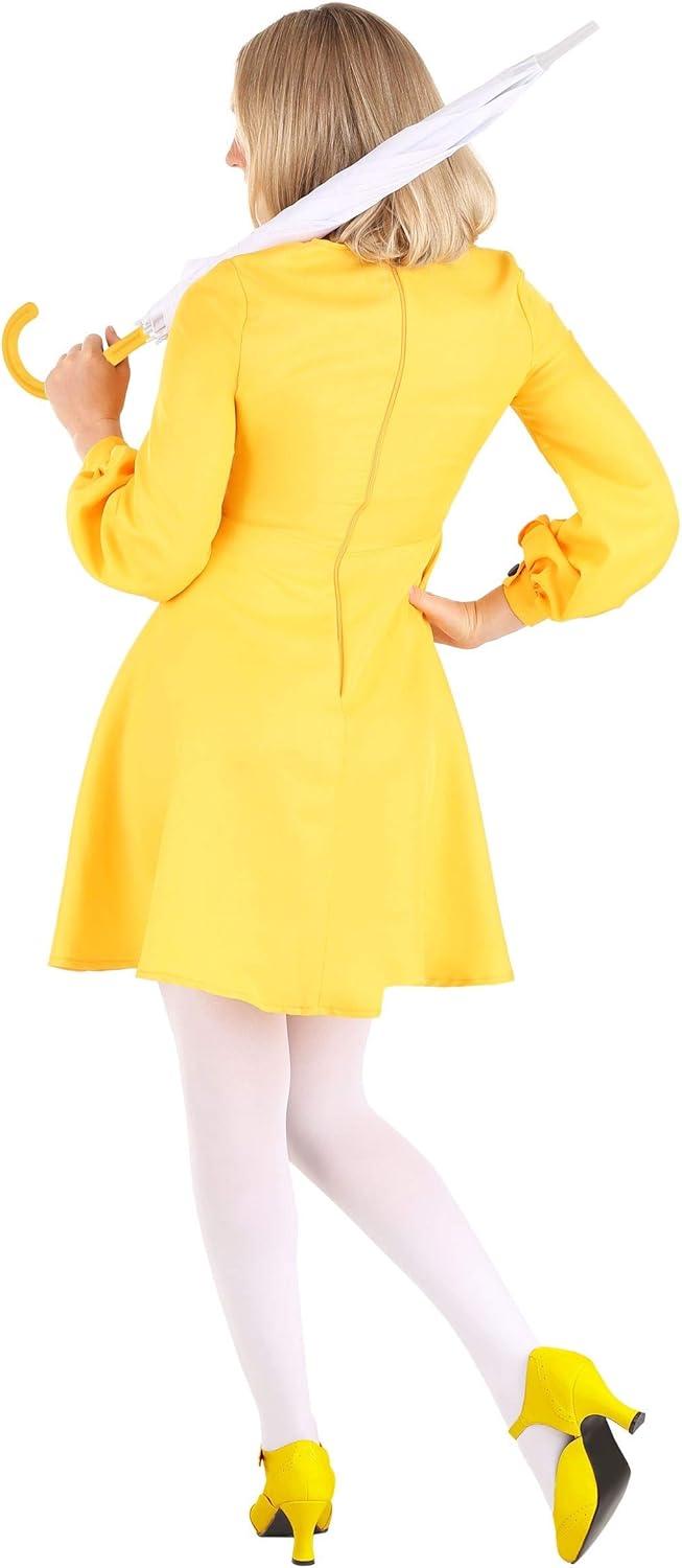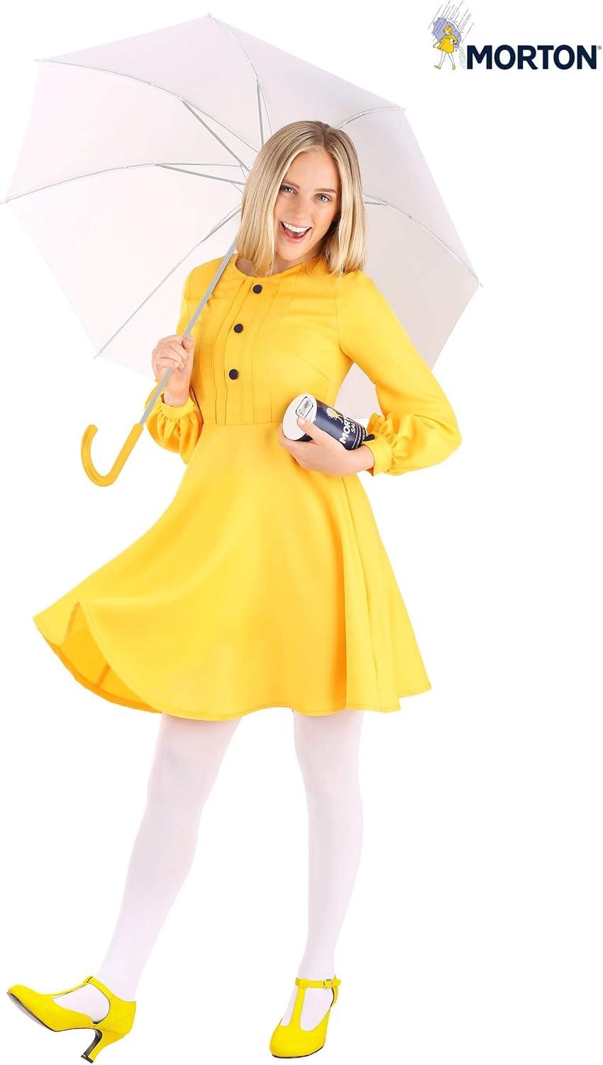 When it rains, it pours; style, that is! Step into an iconic piece of advertising history with this Adult Morton Salt Girl Costume, a look that's as timeless as the classic blue canister in your kitchen. Since 1914, the Morton Salt Girl has been walking through the rain, umbrella in hand, effortlessly spilling salt while capturing hearts. Now, it's your turn to bring this beloved mascot to life. Whether you're making a clever Halloween statement, attending a themed party, or paying tribute to this advertising legend, this instantly recognizable costume will have compliments pouring in. This officially licensed Women's Morton Salt Girl Costume is designed to capture every nostalgic detail of the classic illustration. The vibrant yellow dress features a fitted bodice, decorative front buttons, and a zipper closure at the back for an easy and flattering fit. The long, puffy sleeves are finished with buttoned cuffs, echoing the refined yet playful style of the original character. The swishy skirt adds movement to every step, making it perfect for twirling through any event; rain or shine. Whether you're going solo or pairing up with a friend dressed as a salt shaker or a pepper grinder, this look is a recipe for fun. Of course, the Morton Salt Girl wouldn't be complete without her signature umbrella! This costume includes a fully functional spring-release umbrella with a cheerful yellow handle and a crisp white canopy. Just like in the classic logo, this accessory is the perfect finishing touch to your look. Keep it open for photos or closed at your side as you confidently spill some charm wherever you go. And for those looking to complete the ensemble, we also sell a coordinating salt container purse separately; because even the most famous mascot needs a place to stash her essentials! Perfect for costume parties, nostalgic brand enthusiasts, or anyone who loves a clever pop culture reference, this Morton Salt Girl costume is a unique and stylish choice. – Dress – Umb