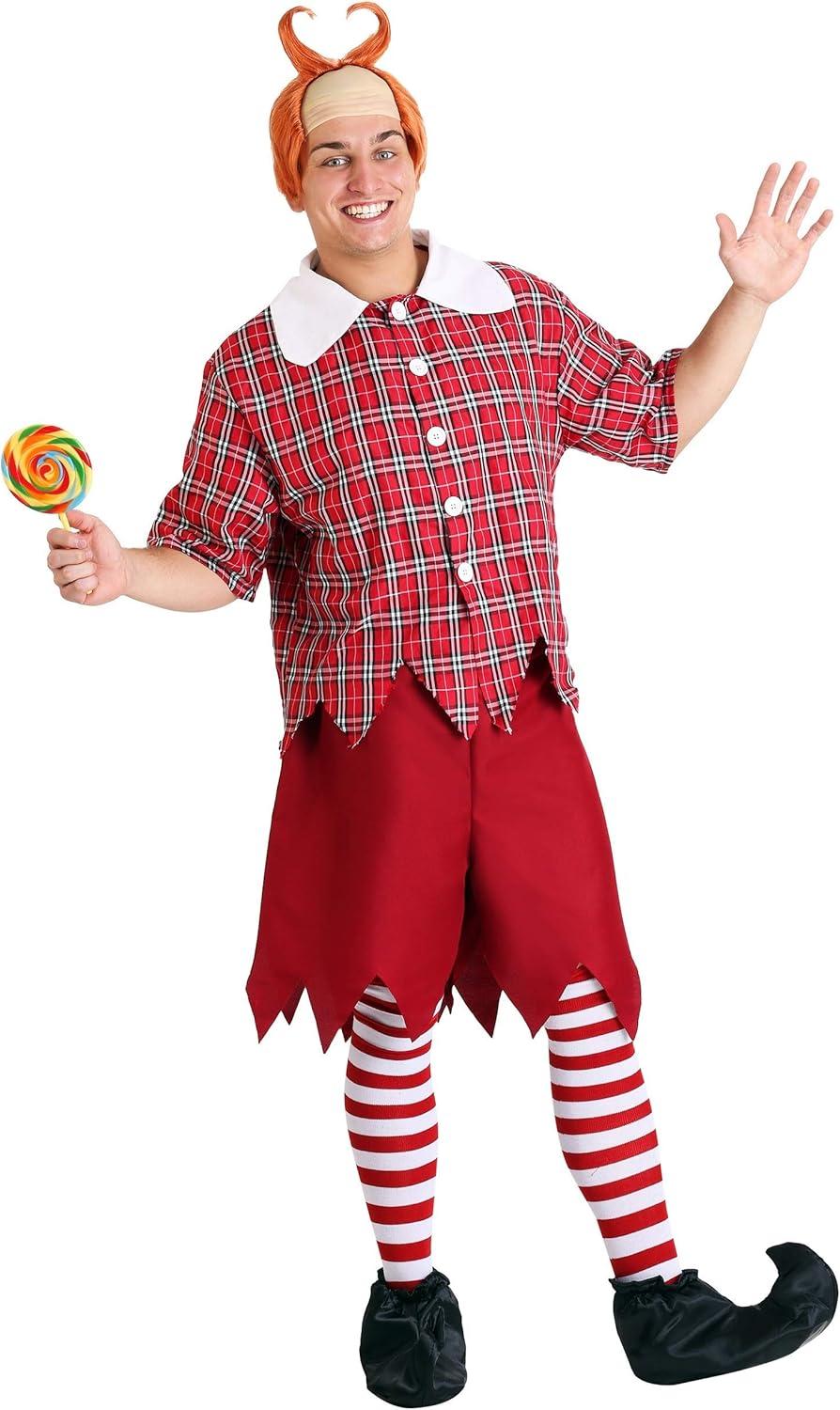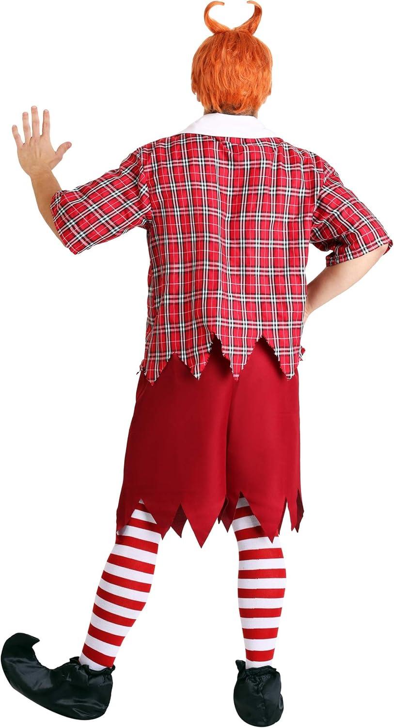 Adult Red Plaid Munchkin Costume – Plaid Shirt, Jagged Hem Shorts, Striped Socks