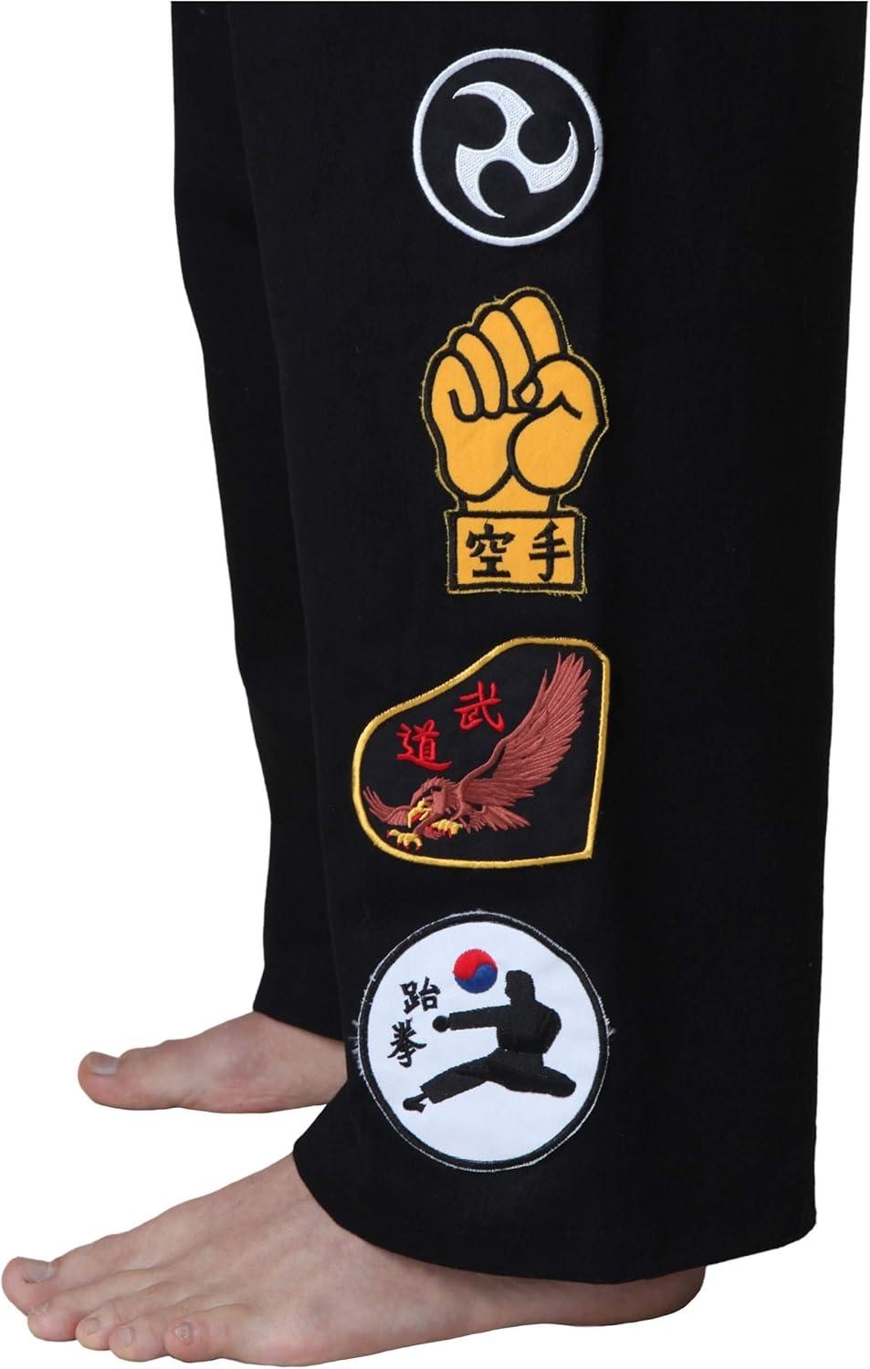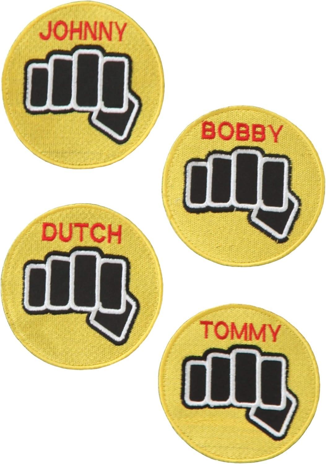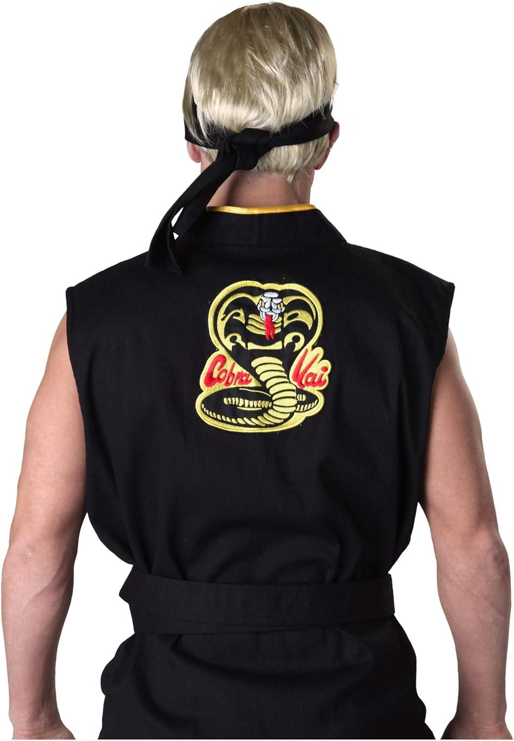 Get ready to channel your inner dojo master with our Karate Kid Cobra Kai Costume! The karate gi top is styled after what iconic bad-boy Johnny Lawrence wore in The Karate Kid, so it is a rich black with yellow trim that crosses your body. It features the Cobra Kai logo on the back and interchangeable name badges that you can wear on the front chest. The matching pants have a drawstring waist for the perfect fit and five embroidered patches on the right leg. Not just a costume, this Cobra Kai outfit is a throwback to one of the most memorable rivalries in film history! Perfect for movie-themed parties, Halloween shenanigans, or simply reliving those '80s vibes, our Karate Kid Cobra Kai Costume is a must-have for fans. The quality is evident in the fine detailing and the embroidered patches, showing off just how much care went into replicating the classic look. And complete with the included Cobra Kai headband everyone will dig your karate persona. Whether you're practicing your crane kick in the living room or showing off your moves at a party, this costume ensures you'll do it in style. So, gear up and let the Cobra Kai legacy live on!