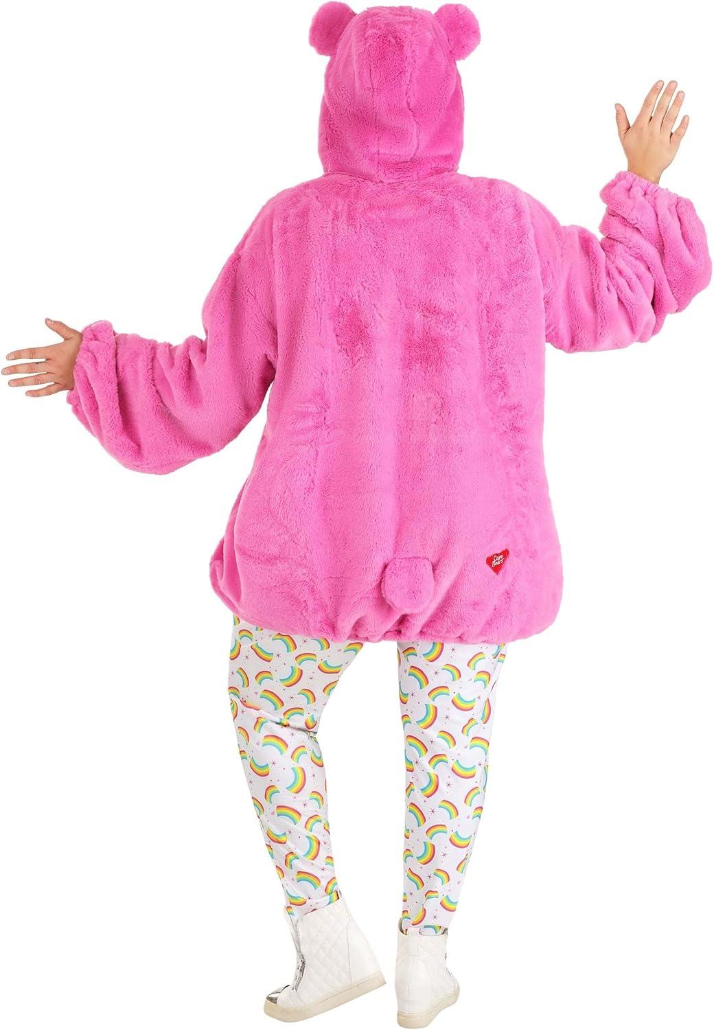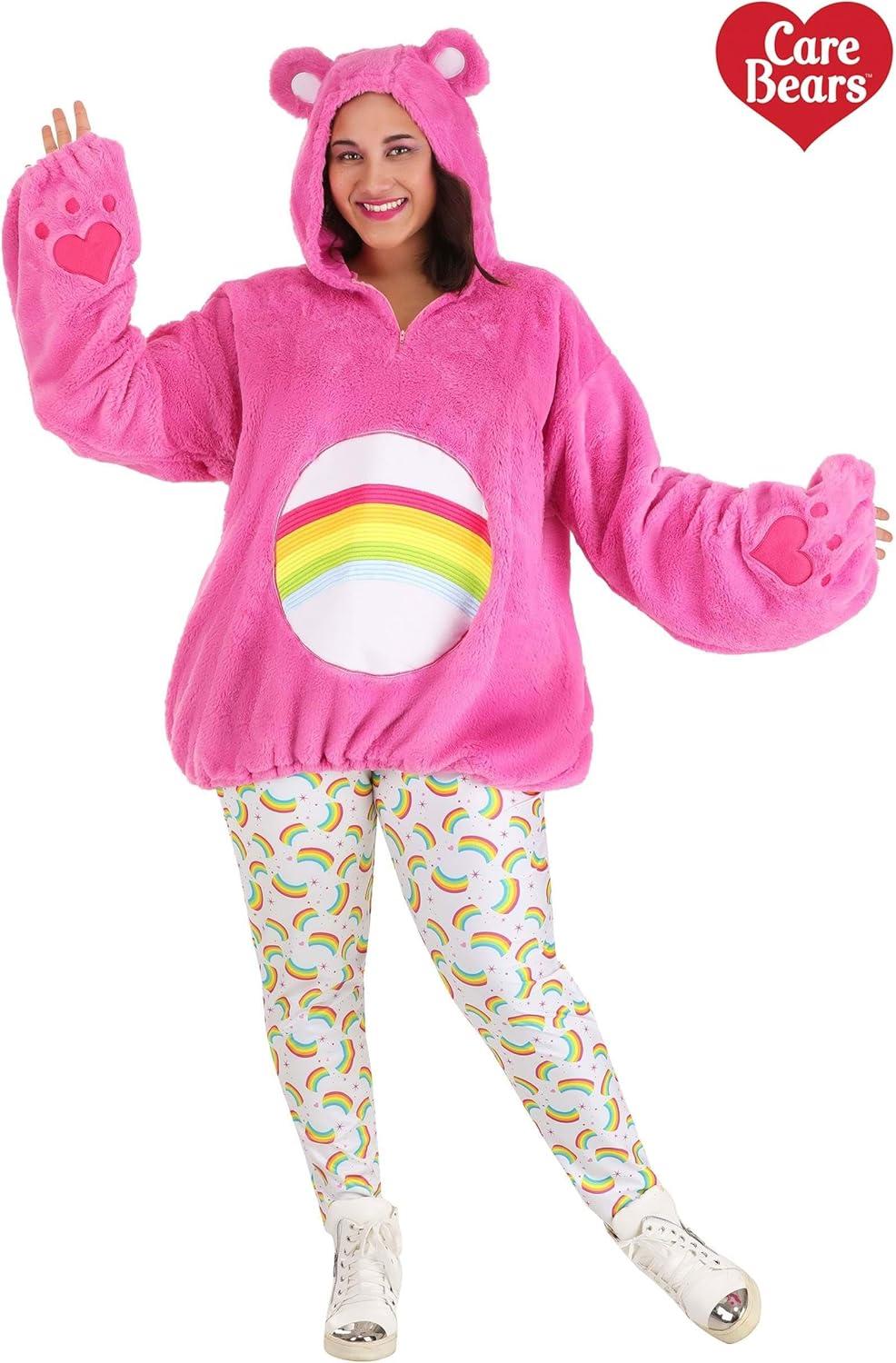 The Fun Costumes Cheer Bear Hoodie Costume Plus Size As a top costume company, we've teamed up with Care Bears to craft our own line of officially licensed Care Bears Costumes. We're happy to bring our customers the cutest and coolest Care Bears outfits, and one of our most fun designs is our Care Bears hoodie costumes for women. This Cheer Bear hooded outfit is designed for a fresh look that will let you can spread the happiness around just like Cheer Bear herself! Product Design: This Cheer Bear costume for women features a faux fur hoodie and a pair of tights with a magical rainbow print. The pink hoodie has a little tail in back and ears on the hood for cute Care Bears touches. And it's embroidered with the licensed Care Bear heart, the all-important belly badge, and little paws on the over-sized sleeves. The hem cinches with a drawstring so you can adjust the look to your choosing. It's a fun, comfy, and very cheerful look for any costume party!