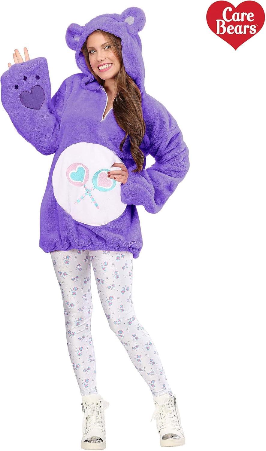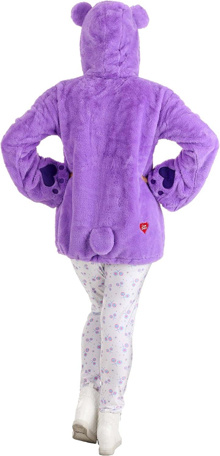 The Fun Costumes Share Bear Hoodie Costume for Women As a top costume company, we've teamed up with Care Bears to craft our own line of officially licensed Care Bears Costumes. We're happy to bring our customers the cutest and coolest Care Bears outfits, and one of our most fun designs is our Care Bears hoodie costumes for women. This Share Bear hooded outfit is designed for a fresh look that will help you prove that sharing is caring! Product Design: This Share Bear costume for women features a faux fur hoodie and a pair of tights with a lollipops and stars print. The purple hoodie has a little tail in back and ears on the hood for cute Care Bears touches. And it's embroidered with the licensed Care Bear heart, the all-important belly badge, and little paws on the over-sized sleeves. The hem cinches with a drawstring so you can adjust the look to your choosing. It's a fun, comfy, and super-sweet look for any costume party! Product Details: 100% polyester faux fur top; 86% polyester, 14% spandex leggings Hooded pullover top has zipper yoke Elastic sleeve cuffs, drawstring with cord lock in hemline Embroidered & appliqued belly badge Leggings have elastic waistband, all-over lollipops print Officially licensed Size Chart: XS: Chest=41 1/2″; Sleeve Length=25″; Top Length=27 1/2″; Leggings Waist=24″ – 27″; Leggings Length=38 1/2″ S: Chest=43 1/2″; Sleeve Length=25″; Top Length=28 1/2″; Leggings Waist=26″ – 29″; Leggings Length=38 1/2″ M: Chest=47 1/2″; Sleeve Length=26″; Top Length=29 1/2″; Leggings Waist=28″ – 32″; Leggings Length=38 1/2″ L: Chest=51 1/2″; Sleeve Length=26″; Top Length=30 1/2″; Leggings Waist=30″ – 35″; Leggings Length=38 1/2″ About Us: Fun Costumes are exclusively made by us and begin with passion, teamwork, and industry expertise decades in the making. Our products are proof that with the right people even a simple idea can grow into something incredible. We started in a small garage in Minnesota, providing costumes to our local community, and now w