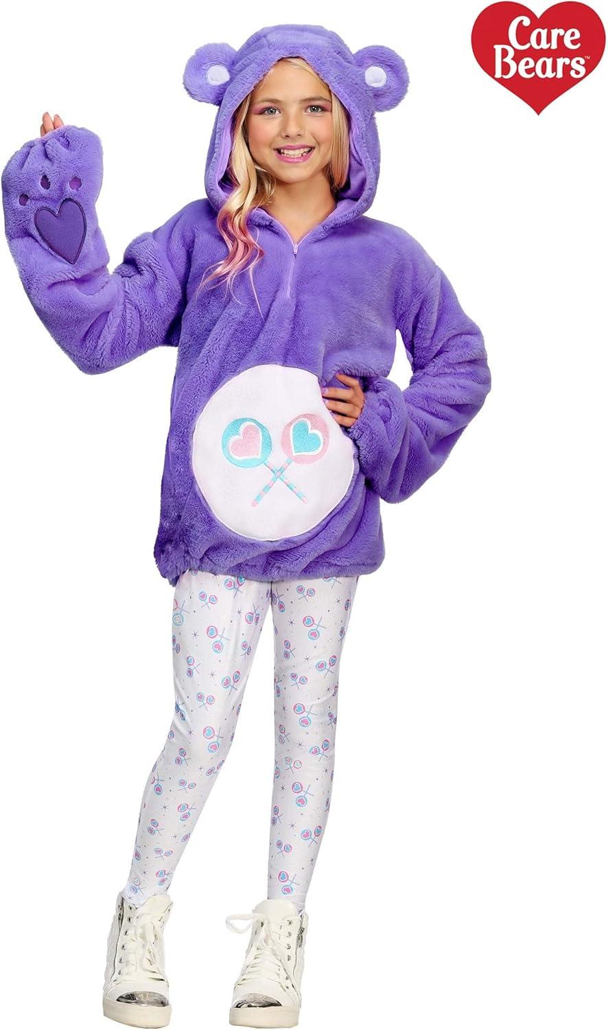 The Fun Costumes Share Bear Hoodie Costume for Kids As a top costume company, we've teamed up with Care Bears to craft our own line of officially licensed Care Bears Costumes. We're happy to bring our customers the cutest and coolest Care Bears outfits, and one of our most fun designs is our Care Bears hoodie costumes for tweens and teens. This Share Bear hooded outfit is designed for a fresh look that will let you prove that sharing is caring just like Share Bear! Product Design: This Share Bear costume for girls features a faux fur hoodie and a pair of tights with a magical rainbow print. The purple hoodie has a little tail in back and ears on the hood for cute Care Bears touches. And it's embroidered with the licensed Care Bear heart, the all-important belly badge, and little paws on the over-sized sleeves. The hem cinches with a drawstring so you can adjust the look to your choosing. It's a fun, comfy, and sugary sweet look for any costume party! Product Details: 100% polyester faux fur top; 86% polyester, 14% spandex leggings Hooded pullover top has zipper yoke Elastic sleeve cuffs, drawstring with cord lock in hemline Embroidered & appliqued belly badge Leggings have elastic waistband, all-over lollipops print Officially licensed Size Chart: M: Chest=35″; Sleeve Length=21″; Top Length=23″; Leggings Waist=24″ – 26″; Leggings Length=32 1/2″; Child Size=8-10 L: Chest=39″; Sleeve Length=23″; Top Length=25″; Leggings Waist=25″ – 27″; Leggings Length=36 1/2″; Child Size=12-14 XL: Chest=41″; Sleeve Length=24″; Top Length=27″; Leggings Waist=26″ – 28″; Leggings Length=38″; Child Size=16 About Us: Fun Costumes are exclusively made by us and begin with passion, teamwork, and industry expertise decades in the making. Our products are proof that with the right people even a simple idea can grow into something incredible. We started in a small garage in Minnesota, providing costumes to our local community, and now we're creating costumes for people all around the world. –