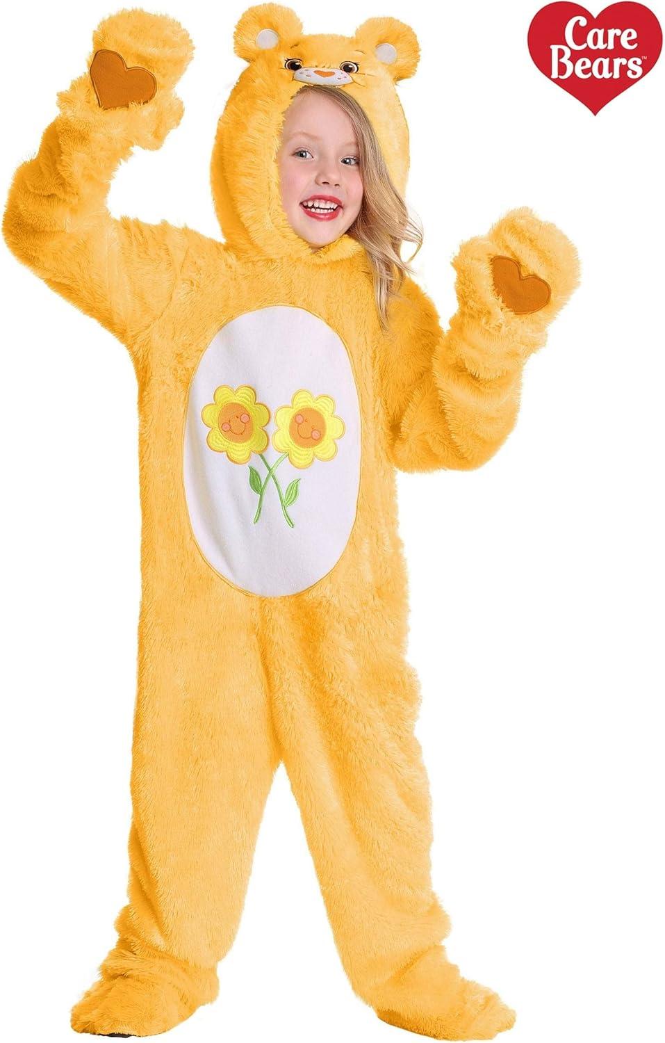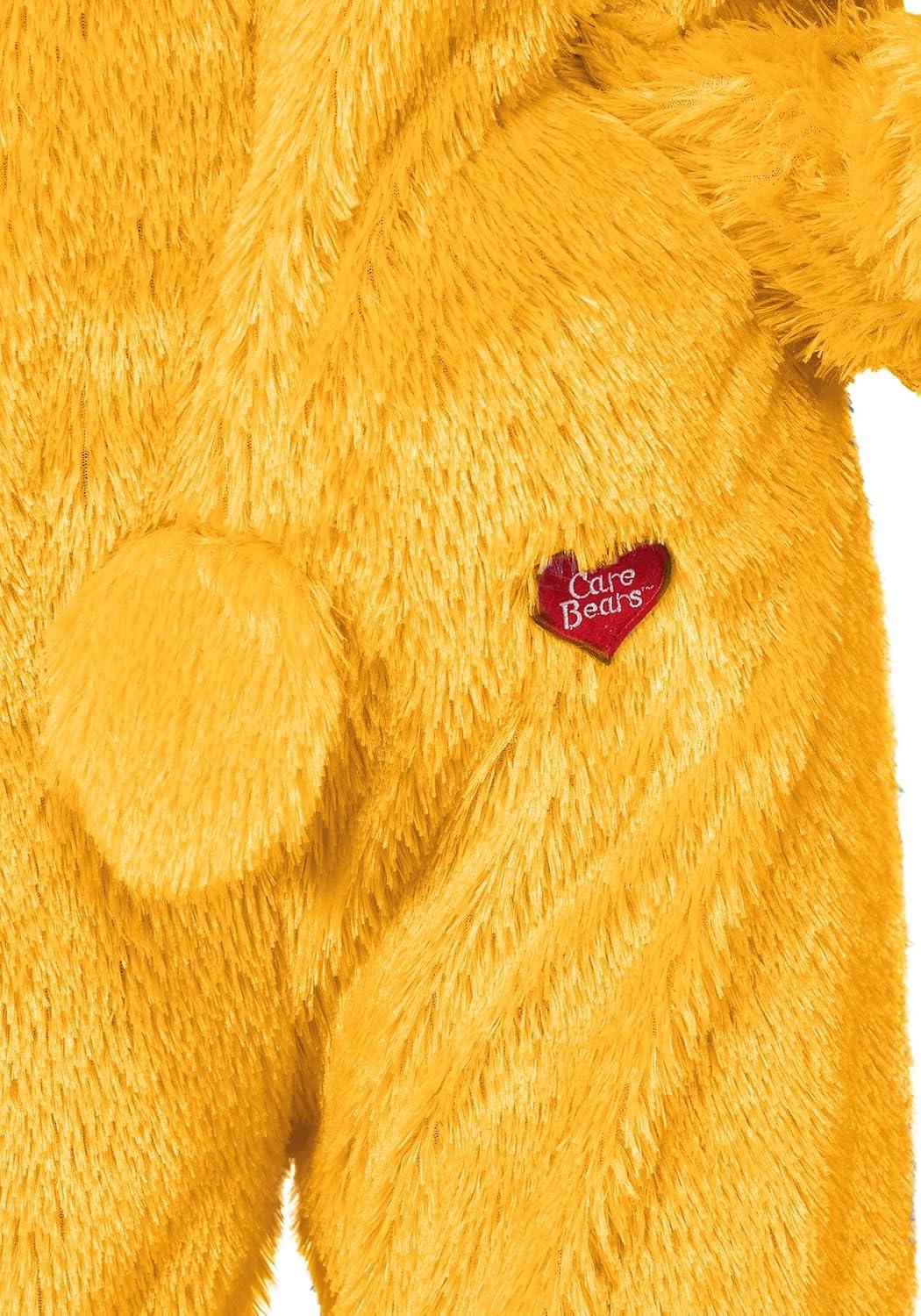 We designed this Friend Bear Care Bears costume as a yellow faux fur jumpsuit that recreates the cute character style that the Care Bears franchise is known for. It secures with a back zipper and comes with attached mitts decorated with appliqued hearts on the palm. The hood has an embroidered Friend Bear face with attached eyes, ears, and a plush 3D nose. It comes with matching shoe covers with rib-knit ankle cuffs. The appliqued yellow daises belly badge on the tummy and a Care Bears heart logo near the tail give this costume it's authentic styling.
