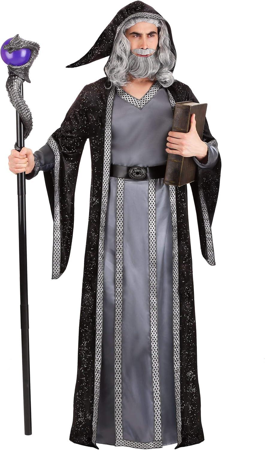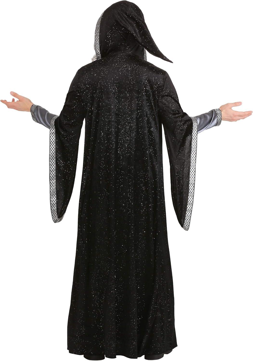 The Fun Costumes Men's Dark Wizard Costume A spellcasting wizard might be able to save the day with some magic or cast dark spells to curse an enemy, but either way, they're a whole lot of fun to have around for Halloween! This deluxe wizard costume for adults lets you play the part of a mysterious wizard. It'll be up to you whether you use your sorcery for good or for evil! Product Design: We designed this adult wizard costume as a long-sleeved pullover satin robe with sleeve cuffs and a neckline that are edged with ornate metallic silver brocade ribbon. The faux leather belt secures with a hook & loop fastener in the back and it features a gunmetal filigree medallion at center front and a satin drape with brocade ribbon trim. Finally, the velour hooded cloak features a pointed hood and long sleeves edged in more ribbon trim and features a glitter finish for a dark and mysterious ambiance. Product Details: 100% polyester satin & velour fabrics Long-sleeved pullover satin robe Robe has sleeve cuffs & V-neckline edged with metallic silver brocade ribbon Faux leather belt has hook & loop fastener at back Belt has gunmetal filigree medallion at center front, satin drape edged with brocade ribbon Glitter-spangled velour hooded cloak has pointed hood & long, hanging sleeves Front edges & sleeve cuffs of cloak are edged with brocade ribbon Size Chart: M: Chest=42″; Robe Sleeve Length=25″; Cloak Sleeve Length=13″; Total Length (robe & cloak are the same)=60″; Belt Length=34″; Belt Drape Length=39″ L: Chest=46″; Robe Sleeve Length=25″; Cloak Sleeve Length=13″; Total Length (robe & cloak are the same)=60″; Belt Length=38″; Belt Drape Length=39″ XL: Chest=50″; Robe Sleeve Length=25″; Cloak Sleeve Length=13″; Total Length (robe & cloak are the same)=60″; Belt Length=42″; Belt Drape Length=39″ About Us: Fun Costumes are exclusively made by us and begin with passion, teamwork, and industry expertise decades in the making. Our products are proo