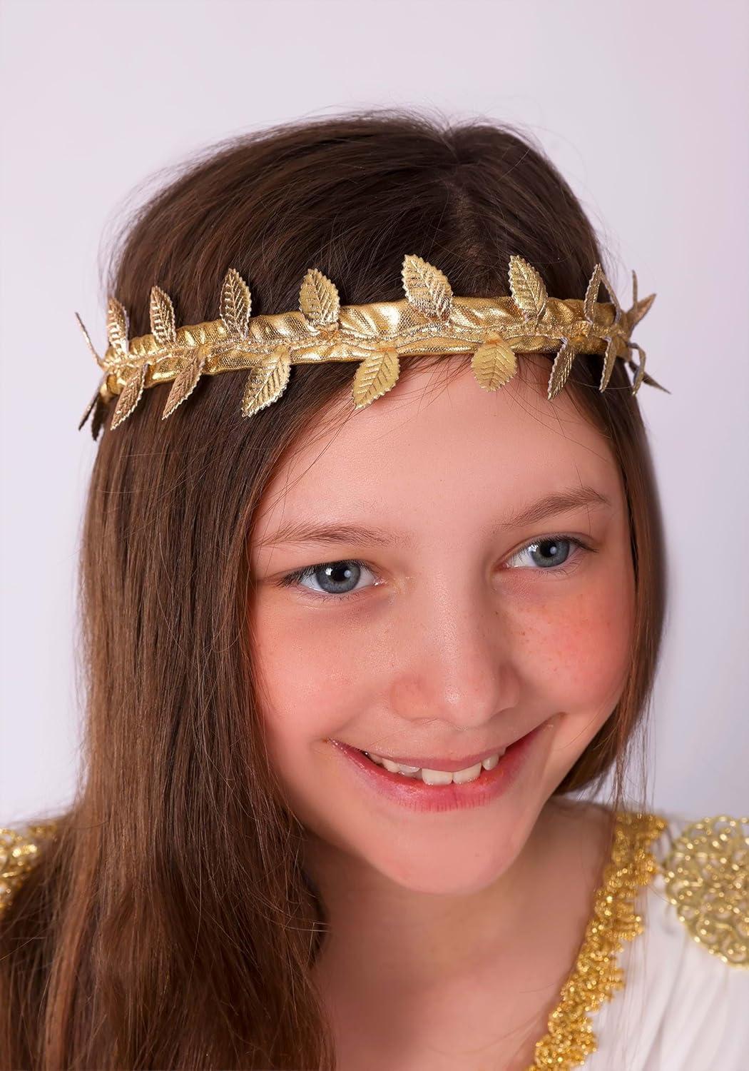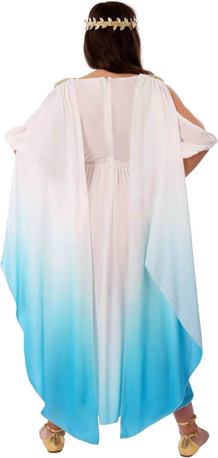 The Kid's Deluxe Goddess Costume is a beautifully crafted ensemble, perfect for bringing to life the elegance and grace of ancient myths. Made from 100% polyester jersey knit fabric, the dress features a convenient back zipper and an elastic waistband at the back, ensuring a comfortable fit for active children. The design includes puffed short open shoulder sleeves with elastic cuffs, adding a touch of classical style. The dress's bodice is a mock wrap style with a deep V-neck, elegantly edged with metallic gold braid for a regal appearance. This detail, combined with the skirt's asymmetric hemline, which is longer in the back, creates a striking silhouette reminiscent of ancient goddesses. A unique feature of the costume is its stunning ombré color gradient, which flows from deep turquoise at the hem to white at the shoulders, mimicking the colors of the sea and sky. Functionality meets style with the front waist's sewn-on ribbon sash, featuring hanging cords that can be tied as desired for a customized fit. The dress is further enhanced with drapes that are anchored at the shoulders by gold-tone metal filigree medallions, adding a touch of sophistication and historical authenticity. Completing the ensemble is a headband that fastens with a hook and loop at the back. It is adorned around its circumference with fabric leaves, crowning the wearer and adding to the overall goddess-like appearance. This costume is ideal for a range of occasions, from Halloween and themed parties to school plays, allowing any girl to embody the essence of a goddess with elegance and poise. – Dress – Headband