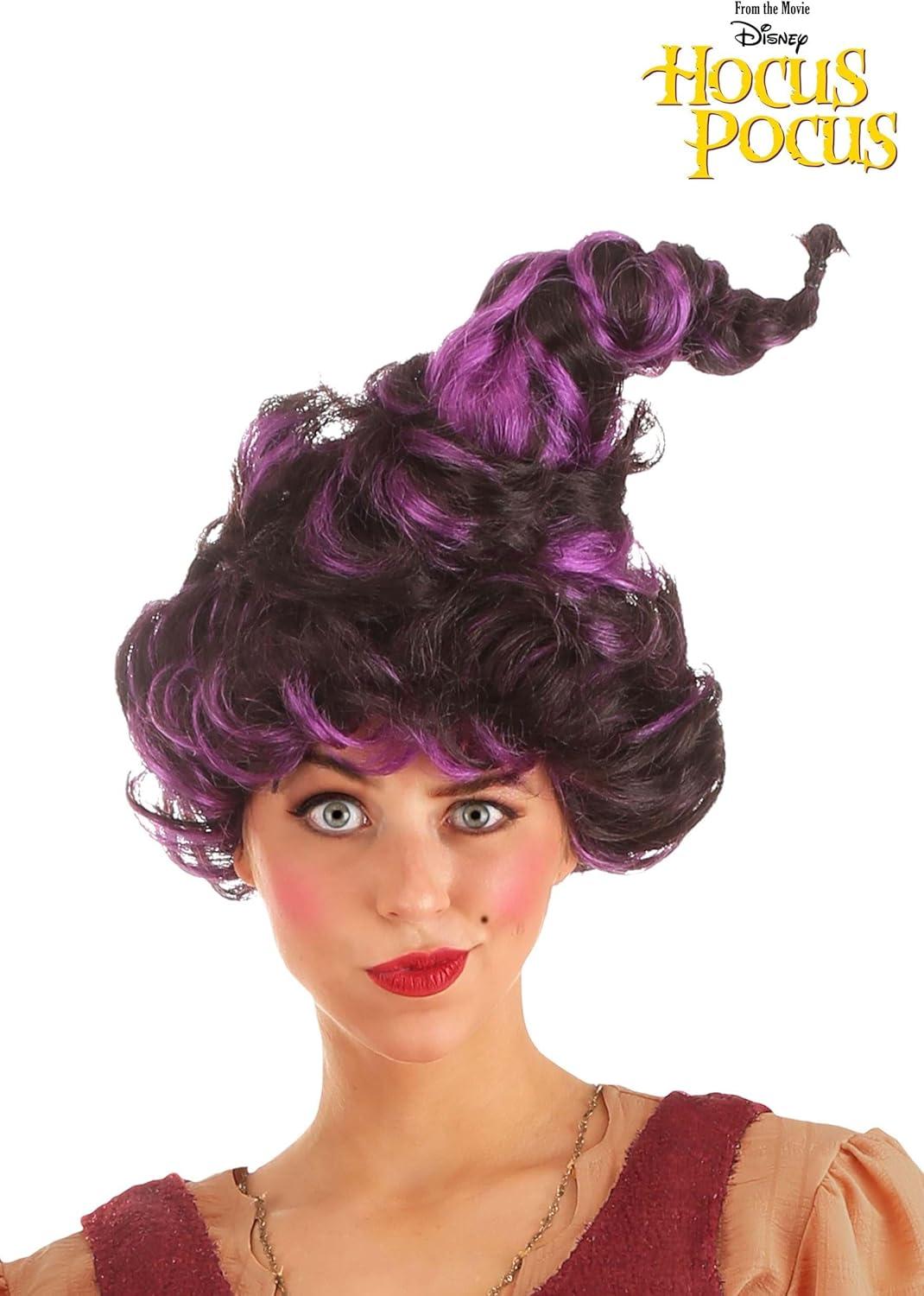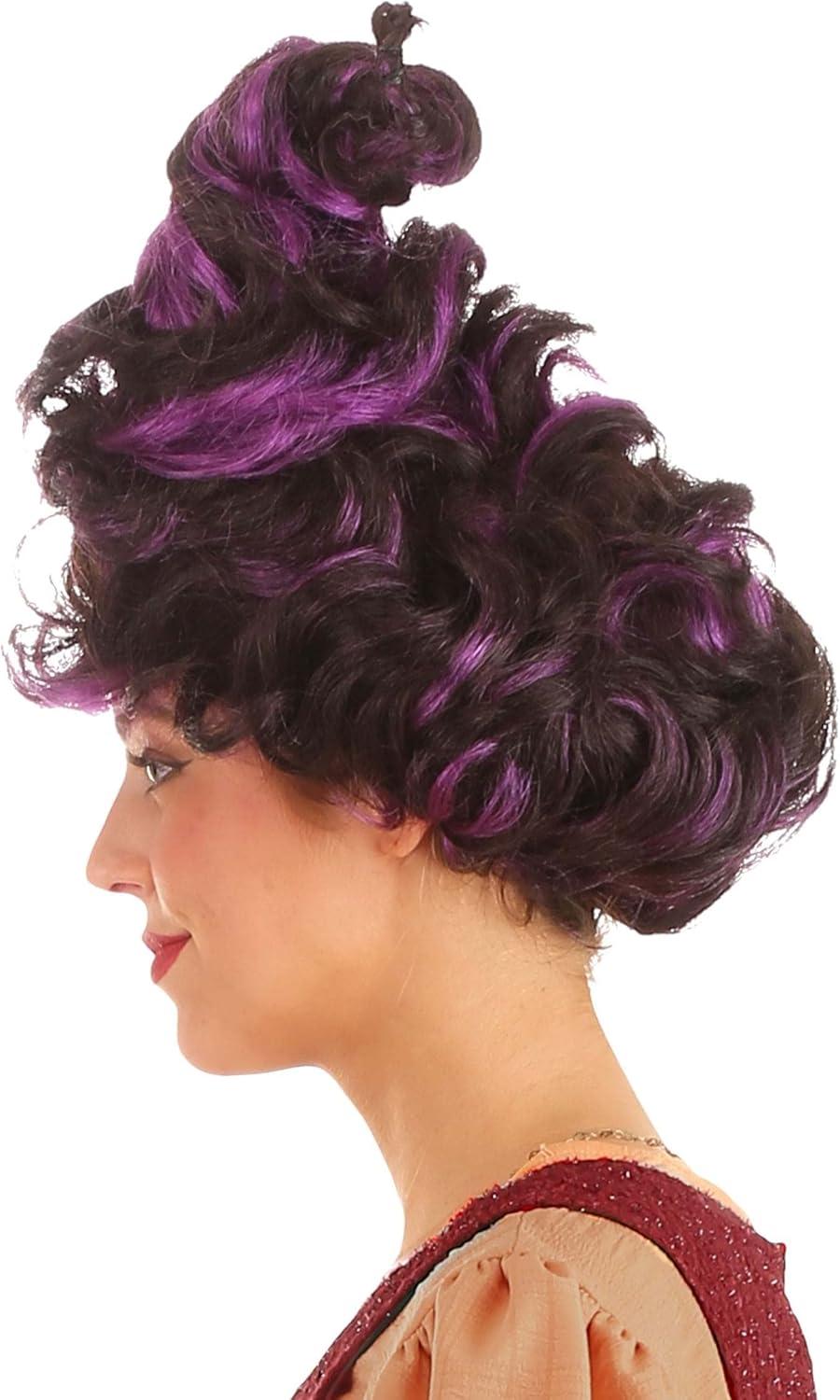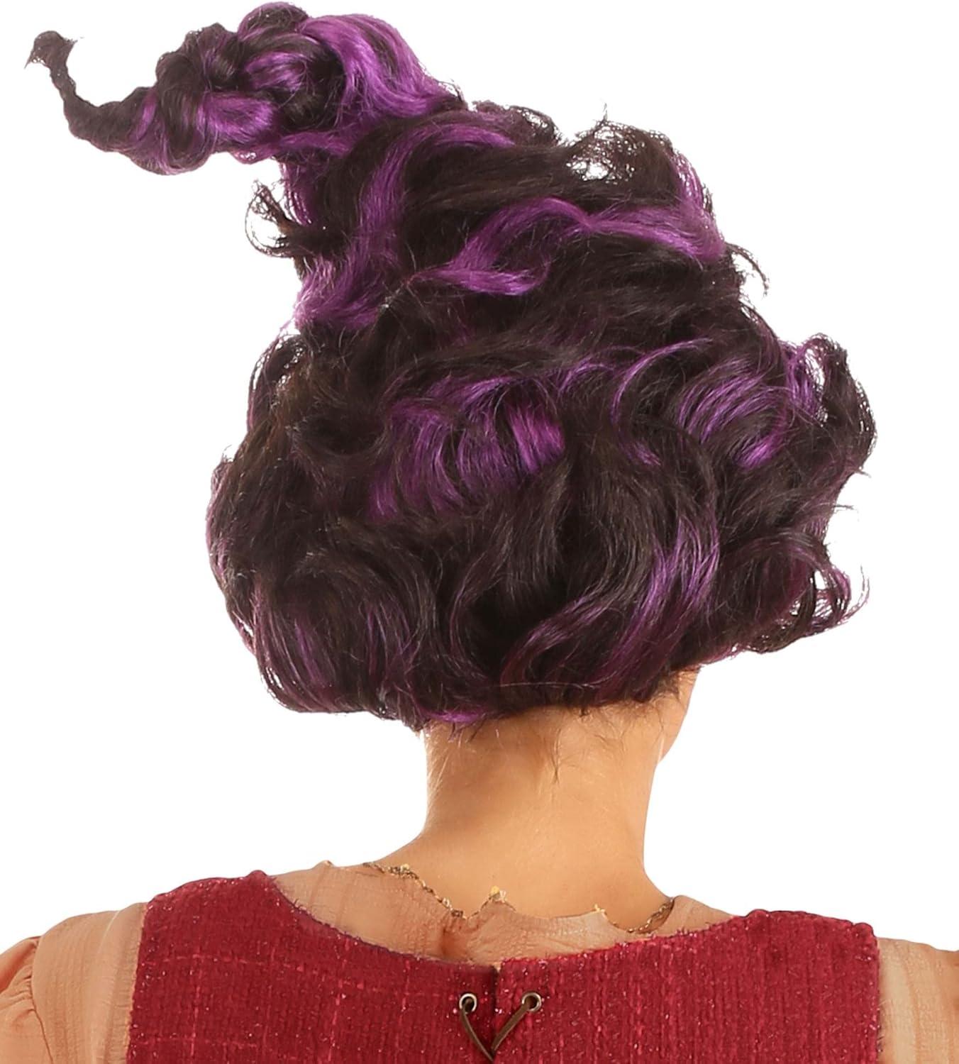The classic witch is recognized by their broomstick, black gown, and pointy hat. But who wants to look just like every other witch? When you have the opportunity to dress up and make it memorable, we recommend taking inspiration from Disney's Hocus Pocus, specifically the endearing Mary Sanderson and her whimsical hairstyle! With this officially licensed Disney Mary Sanderson Wig, you'll be able to sport a hairdo that is truly unique. The design is inspired by Mary's own dark and purple-highlighted hair and includes the curvy, conical tips! Set on a mesh cap with an elastic edge, this easy-to-wear wig gives you a truly memorable look in a snap! Our Mary Sanderson Wig boasts an exquisite blend of 100% polyester synthetic hair expertly styled on a breathable mesh wig cap. These synthetic fibers provide an incredibly natural appearance, ensuring you exude the essence of Mary Sanderson with confidence. We understand the importance of comfort during your magical adventures. That's why we've equipped this wig with an elastic edge along the back of the cap, ensuring a snug and secure fit. No matter how spirited your activities get, your wig will stay comfortably in place. Embrace the enchanting allure of Mary Sanderson with a wig that flawlessly replicates her iconic bouffant style. The pièce de résistance? A stiffened braid that dramatically points upward, capturing every detail of Mary's quirky and captivating appearance. When you choose our Mary Sanderson Wig, you're choosing an officially licensed product. This means you're not just getting a wig; you're getting an authentic piece of Hocus Pocus magic that has been approved by the creators, assuring you of its exceptional quality and accuracy. Make a statement at your next costume party, cosplay event, or Halloween celebration with our officially licensed Mary Sanderson Wig. Elevate your transformation to an entirely new level of authenticity and style. Immerse yourself in the world of Hocus Pocus and let your inner en