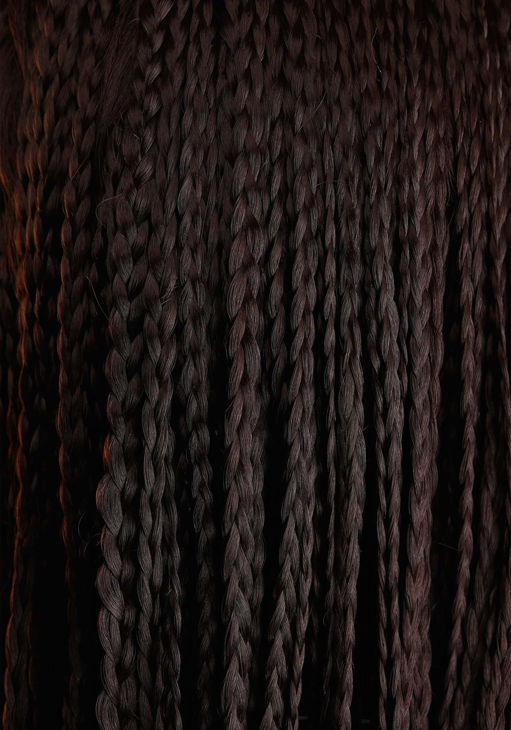 Braided faux hair wig on mesh cap has an elastic edge to secure on head