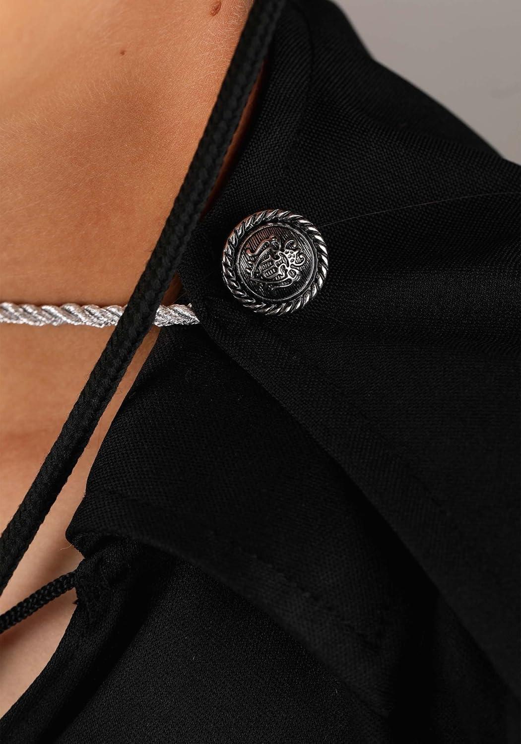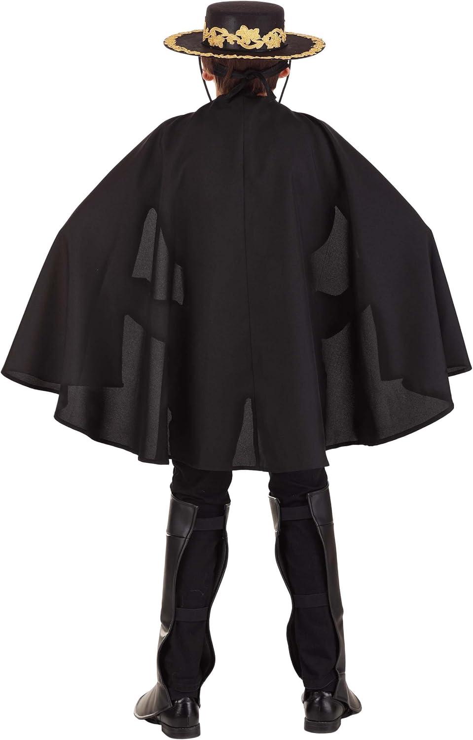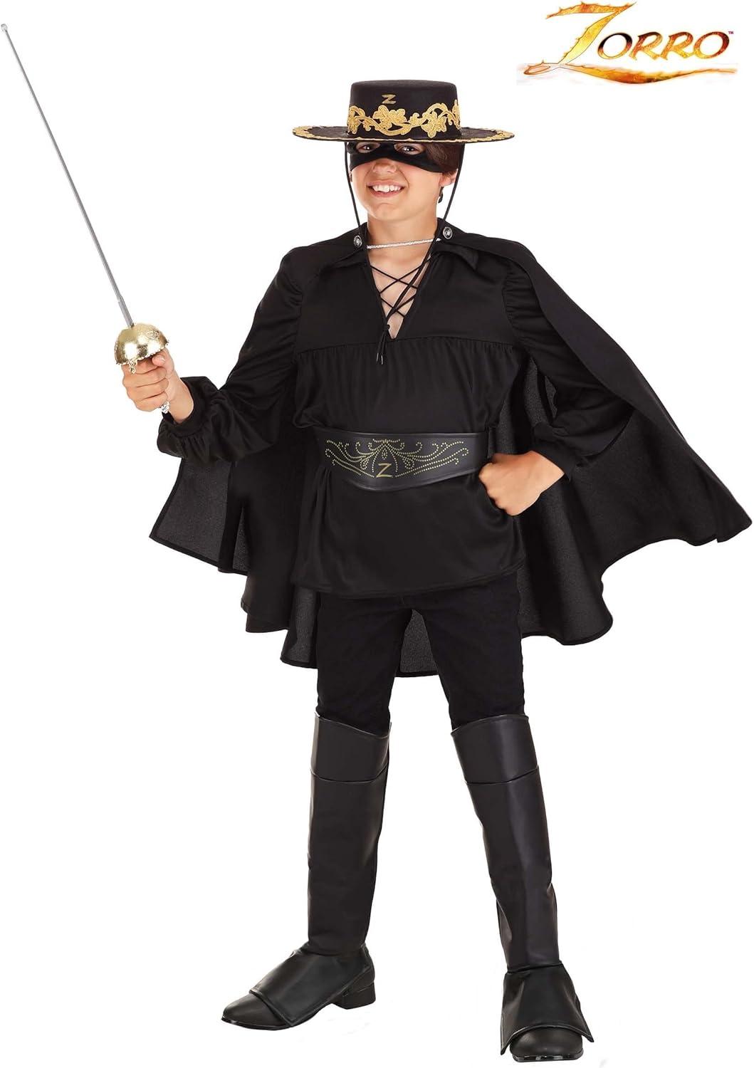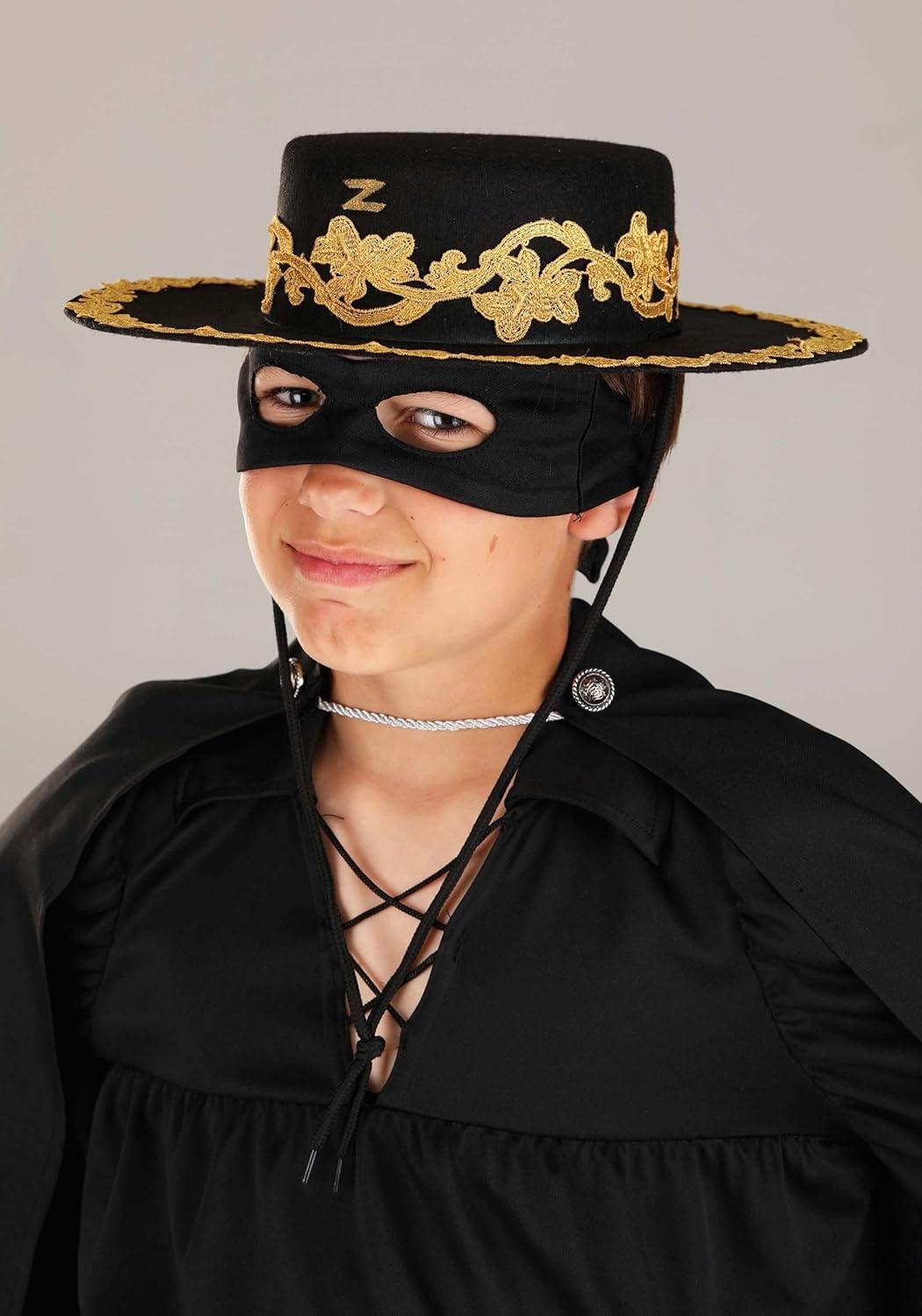 Even the corrupt Alcade will have to admire your style and showmanship when you wear your exclusive, officially licensed Deluxe Kid's Zorro Costume! Made of breathable black jersey knit, the shirt is detailed with a turned-down collar, a laced V-placket, and gently puffed sleeves. Fasten the faux leather belt around your waist and secure the faux leather boot tops under your feet with the attached elastic bands. The black cape fastens around your neck with a silver cord. Top it all off with the molded felt hat, and don't forget your signature black mask! – Shirt – Belt – Cape – Pair of Boot Covers – Mask – Hat