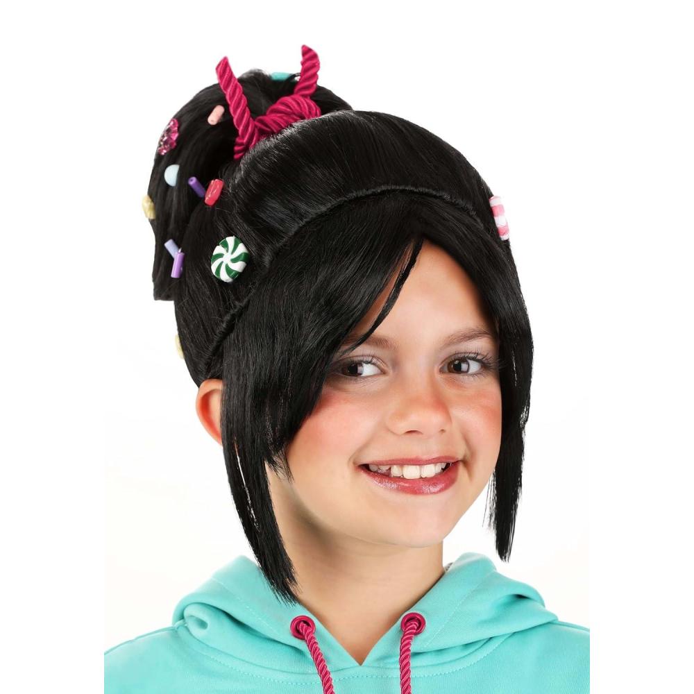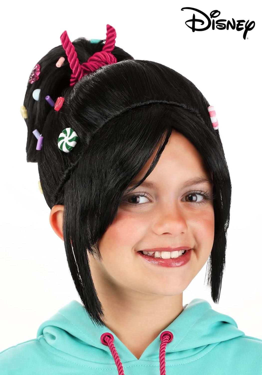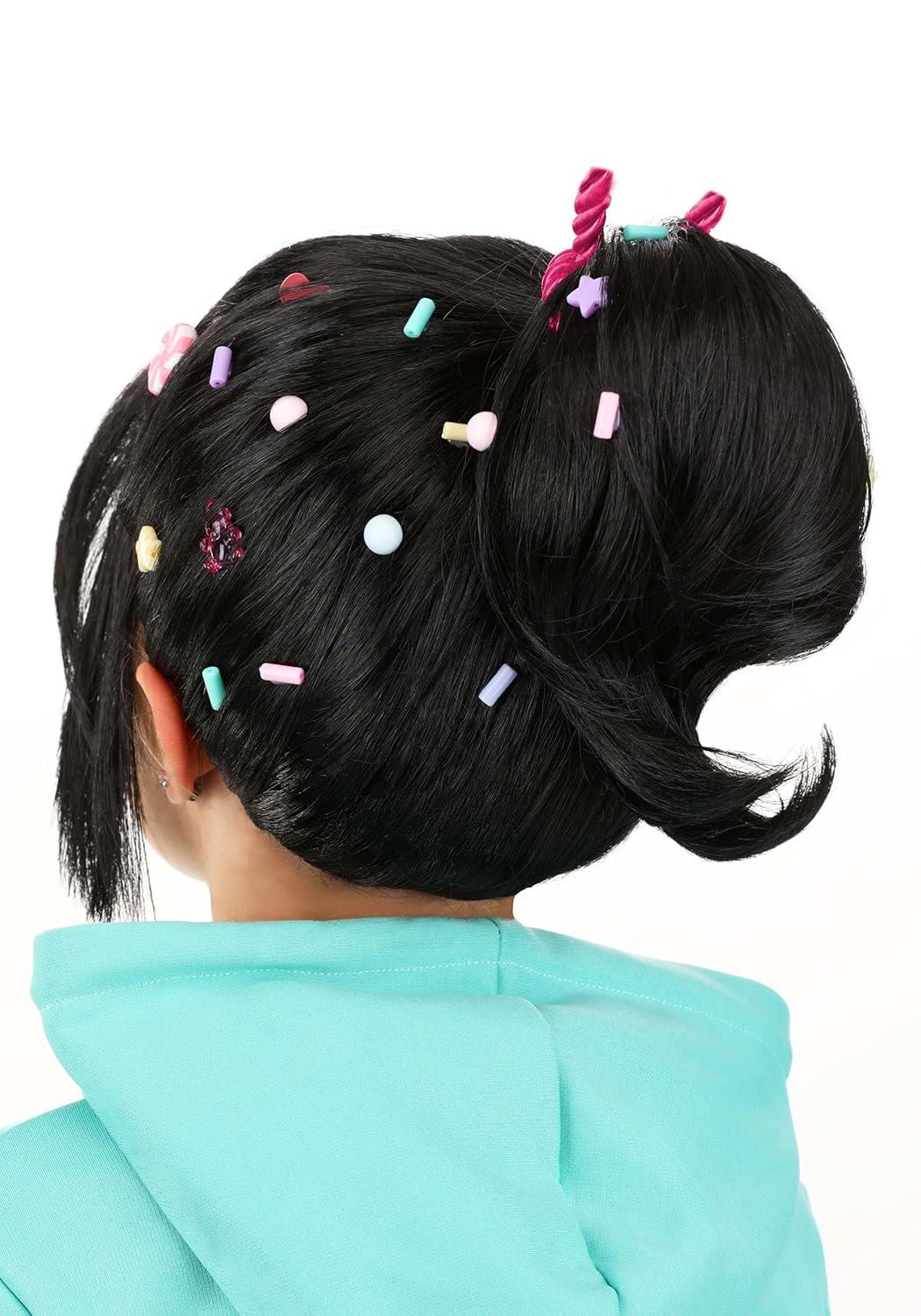 Whimsical Wig Wonder: Dive into the enchanting world of Vanellope with this authentic costume accessory. Styled with black synthetic hair fibers in an updo with side-swept bangs and decorative elements, this wig is designed to delight young fans of Wreck-It Ralph and spark creativity in imaginative play.