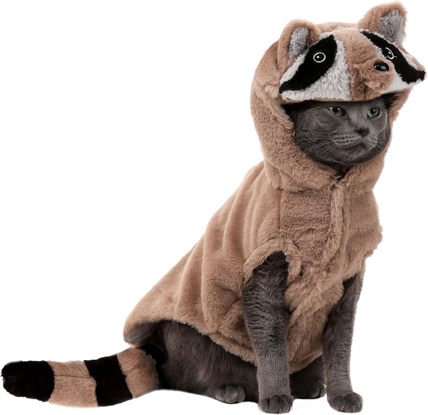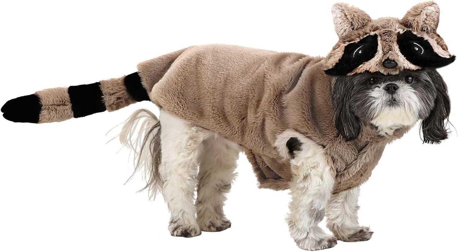 Introducing the Raccoon Costume for Dogs! This adorable costume is perfect for dressing up your furry friend this Halloween. The costume features 100% polyester short-pile faux fur, fiberfill stuffing, and a hook & loop fastener strip at the front along the chest. The hood sits at the top of the dog's head and has openings for the dog's ears. The top of the hood has a soft-sculpted raccoon muzzle with a plastic nose and embroidered eyes. There is a slit at the back of the neck to allow a leash to attach to the collar under the costume. A stuffed raccoon tail is sewn to the back edge of the cape. It's an adorable look for any pup dressing up for Halloween! – Hooded Cape