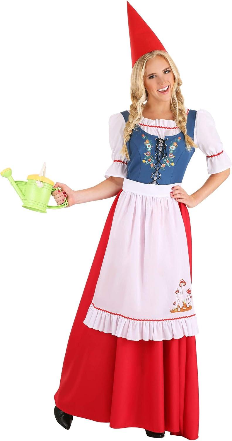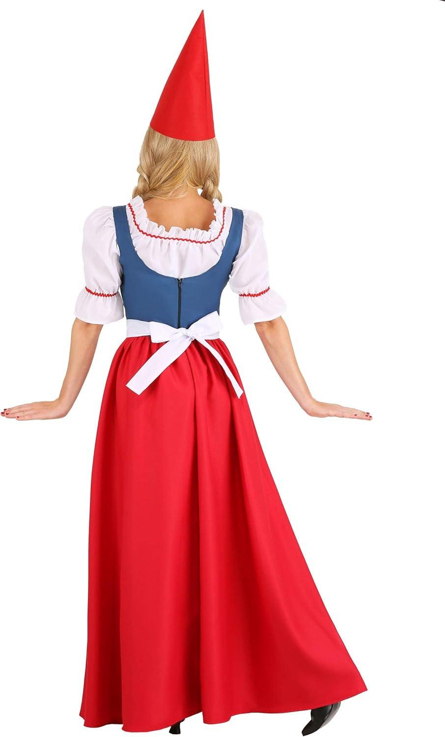 This Garden Gnome costume is a cheerful, timeless design! It features a full-length dress with a red skirt and lace-up bodice that zips up the back. A lightweight blouse with red bric a brac accents is layered underneath the bodice. Matching the blouse, an apron ties around the waist. The whole look is topped off with a cheery red hat for a costume that looks like it's straight out of a storybook! – Blouse – Dress – Apron – Hat