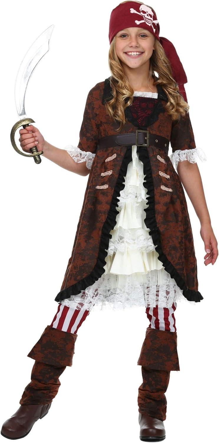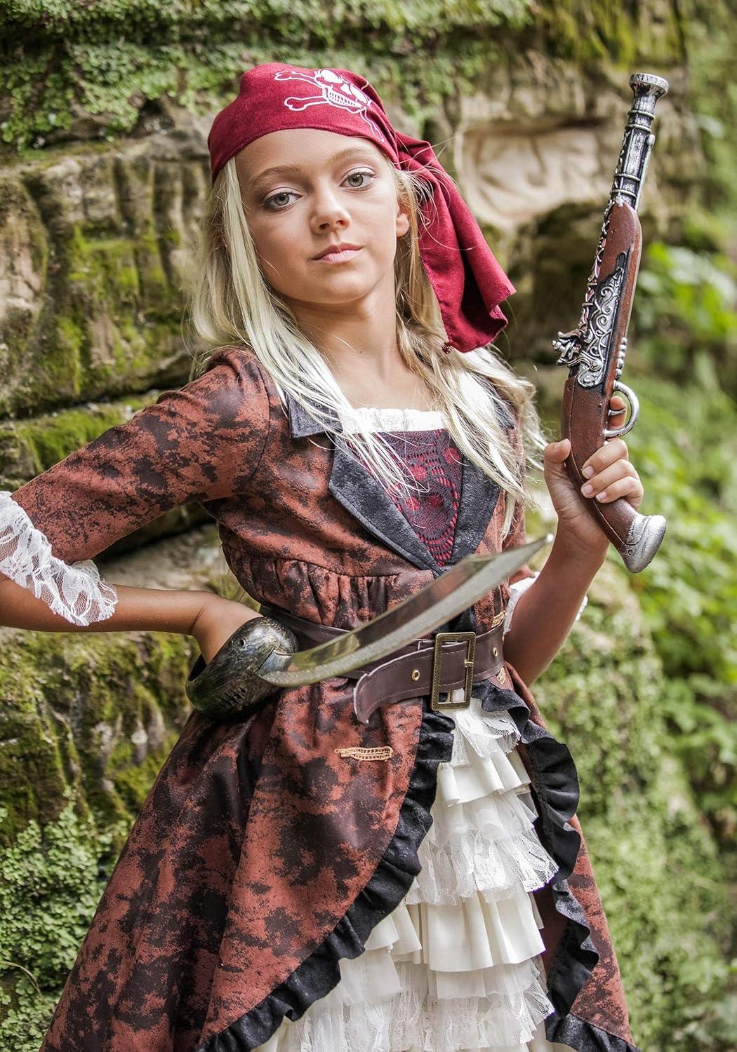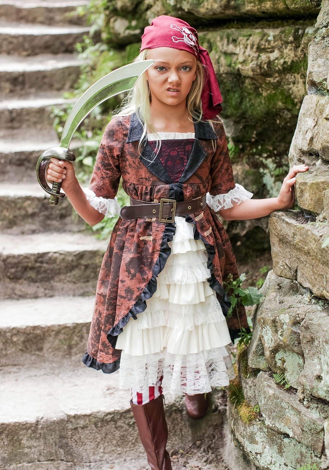 Girl’s Brown Coat Pirate Costume – Dress, Belt, Leggings, Headscarf, Boot Tops