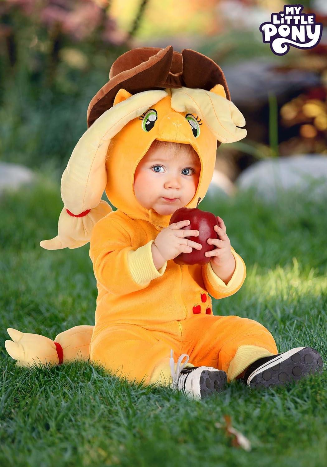 The Infant Applejack My Little Pony Costume is an adorable outfit designed for babies who love the animated television series “My Little Pony: Friendship is Magic”. Made of 100% polyester velour fabric and fiberfill stuffing, this costume is soft, comfortable, and perfect for your little one's delicate skin. The jumpsuit features a hidden front zipper and rib knit wrist and ankle cuffs for easy dressing and a snug fit. An embroidered cutie mark at the left hip adds a touch of authenticity to the outfit, while a fiberfill-stuffed tail sewn to the back of the jumpsuit completes the look. The hood of the costume is also a standout feature. It has a hook and loop fastener on the chin strap to keep it securely in place, and the top of the hood features embroidered eyes, a soft-sculpted hat and ears, and a fiberfill-stuffed mane and forelock. Your baby will look absolutely adorable in this costume, with all the features of Applejack's character. This officially licensed costume is a great way to introduce your baby to the world of My Little Pony and create memories that will last a lifetime. It's perfect for Halloween, dress-up parties, or just for fun at home. Get your baby ready for some pony play with the Infant Applejack My Little Pony Costume!