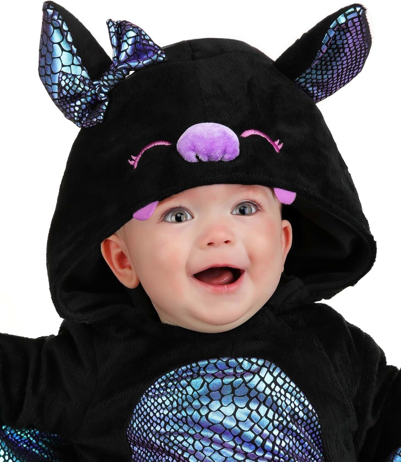 Infant Shiny Bat Costume | Baby Halloween Hooded Jumpsuit with Wings and Hairbow Detail for Animal Dress Up