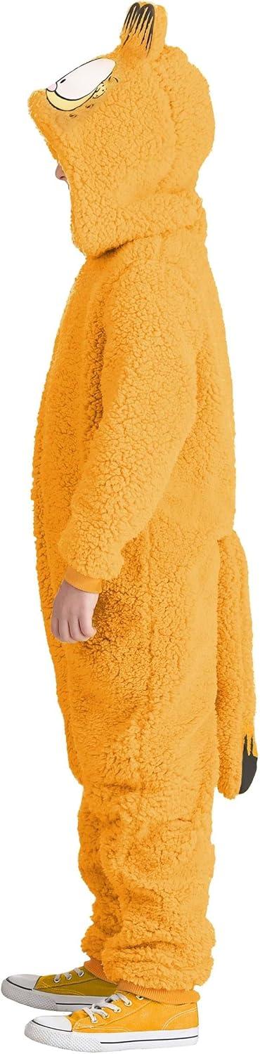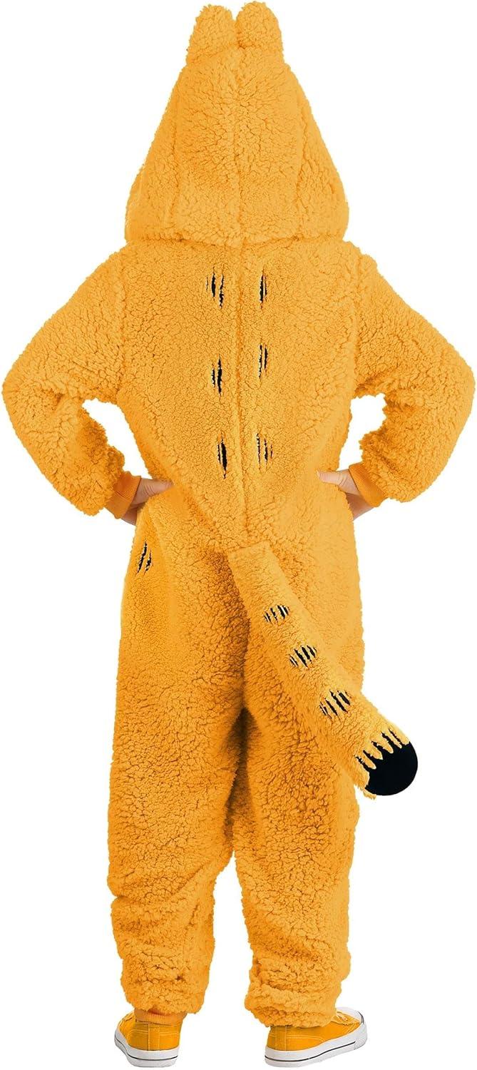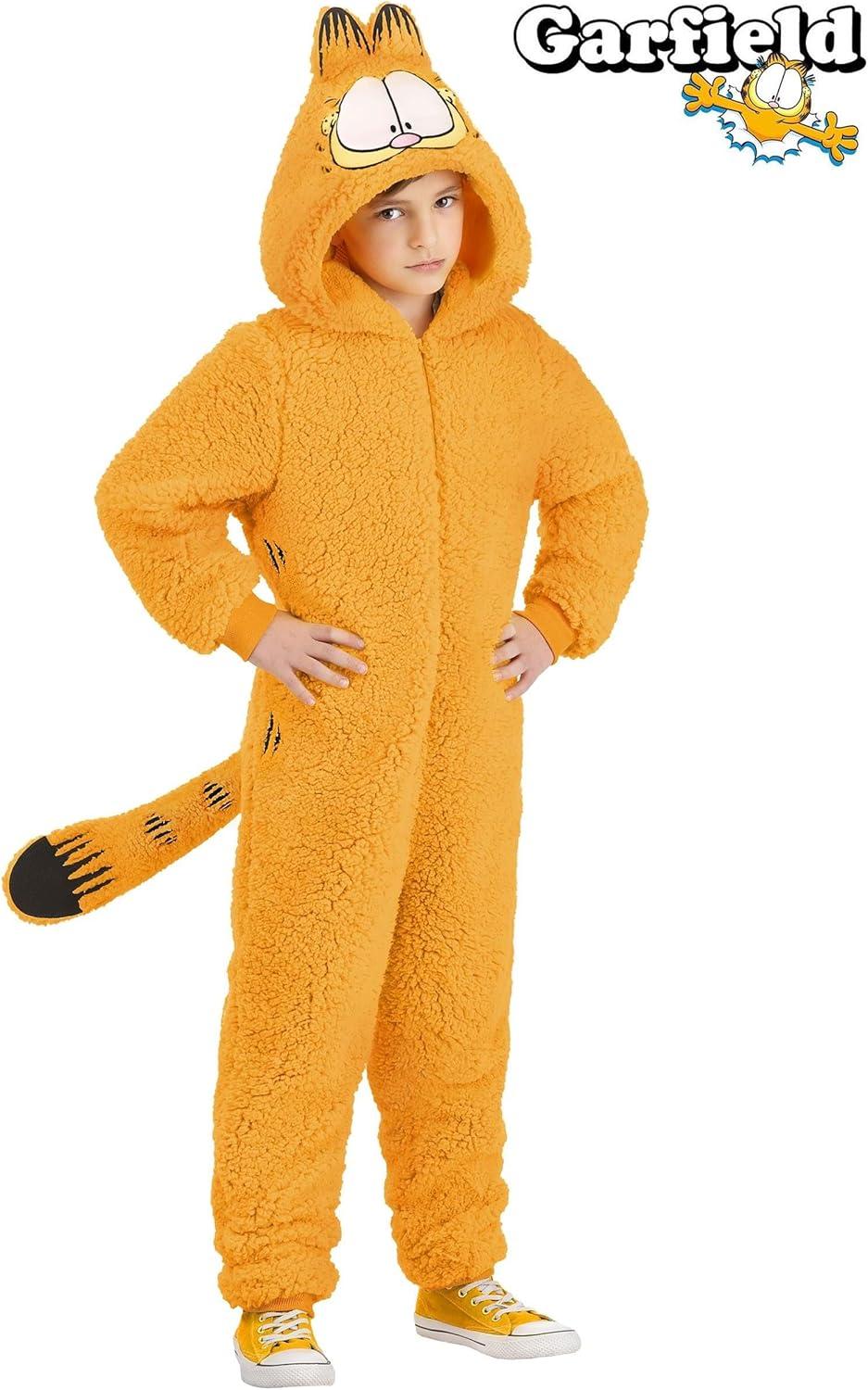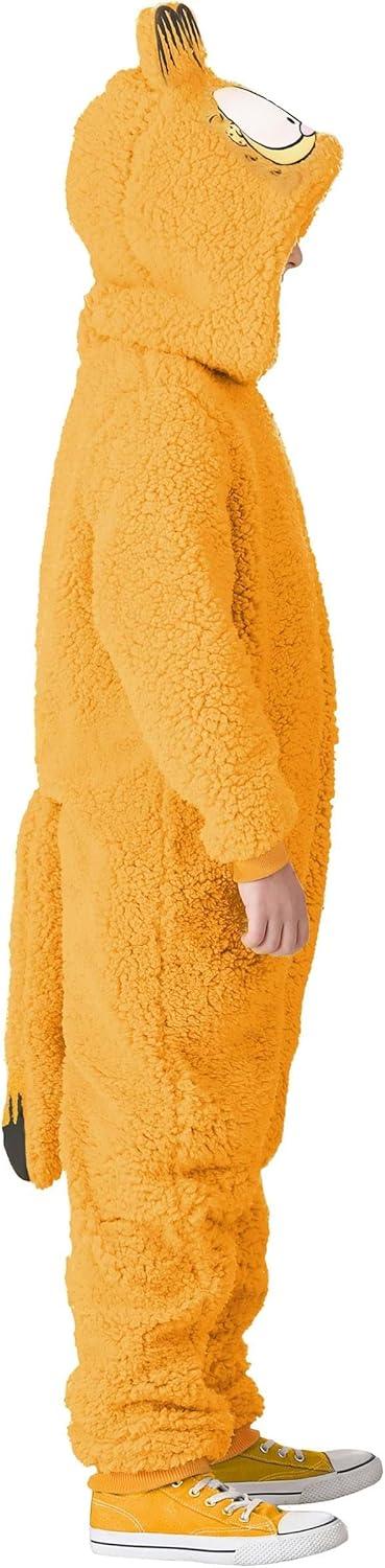 Kids Garfield Costume | Lazy Orange Cat Hooded Plush Jumpsuit with Front Zipper, Attached Tail and Ears