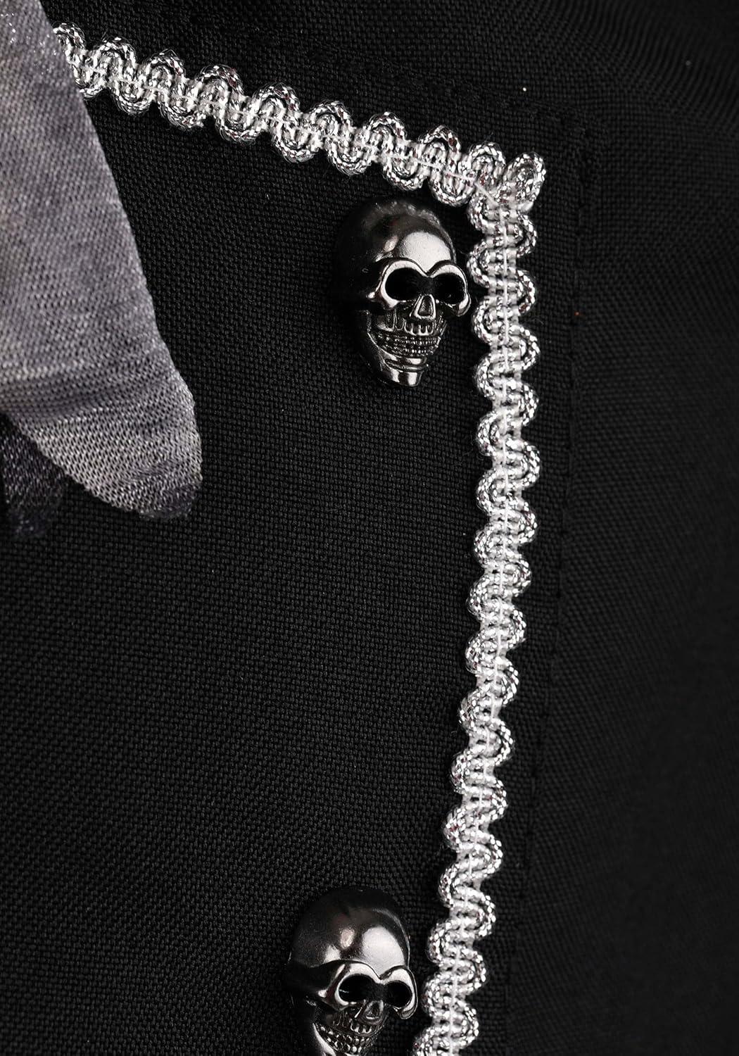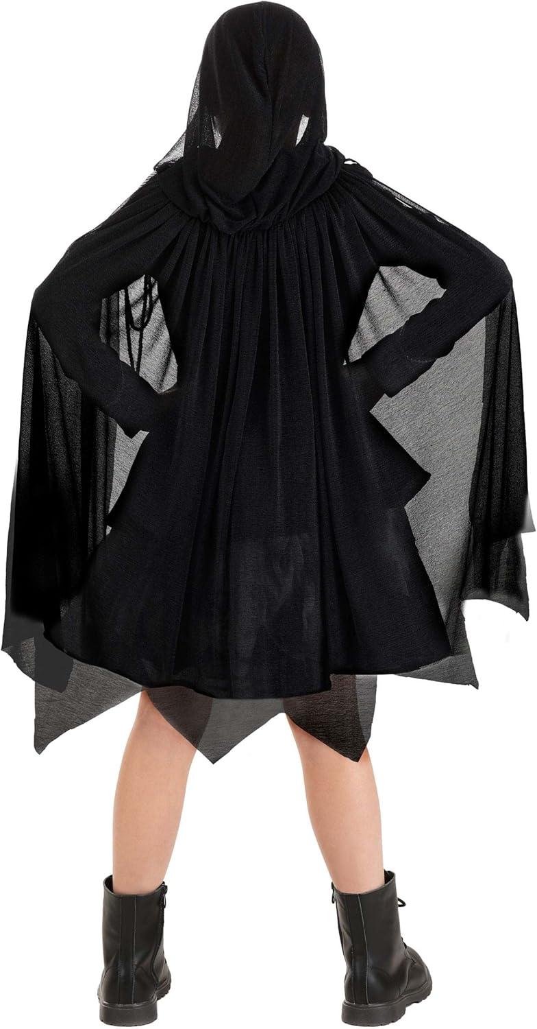 Terrify the town of Sleepy Hollow when you wear your exclusive Headless Horseman Costume Dress for Girls! The outfit's minidress has a black poplin top decorated with metallic silver braid and skull-shaped metal buttons. The skirt features tiers of poplin and satin, as well as a built-in petticoat made of netting. The hooded cape is made of black crepe and has a jagged hemline. Use its attached elastic loops to secure it to the buttons sewn to the back of the dress. – Dress – Hooded Cape