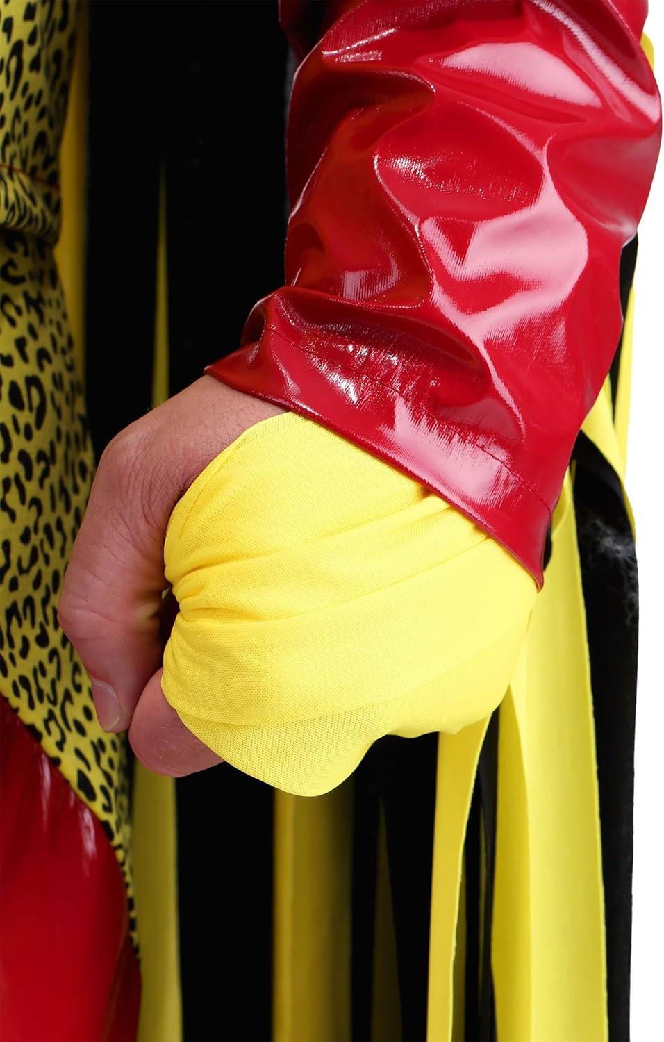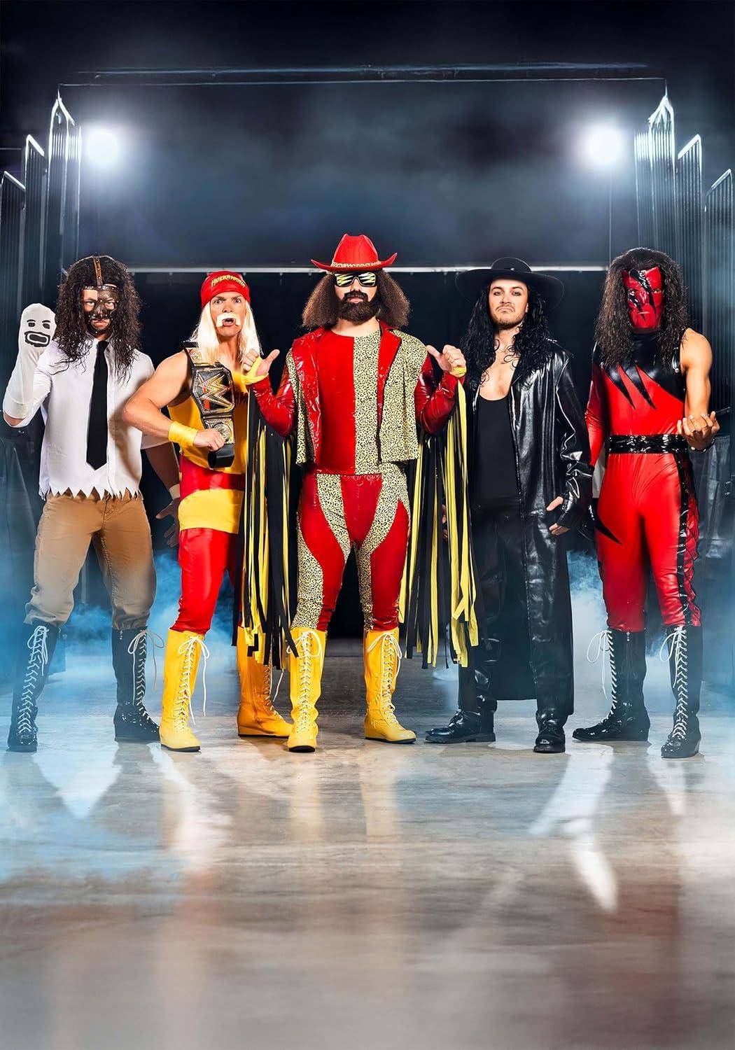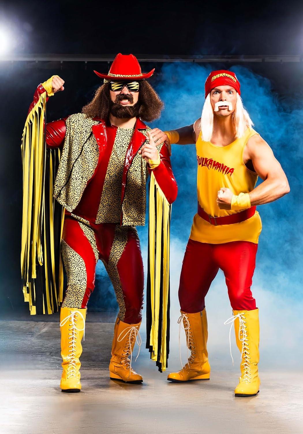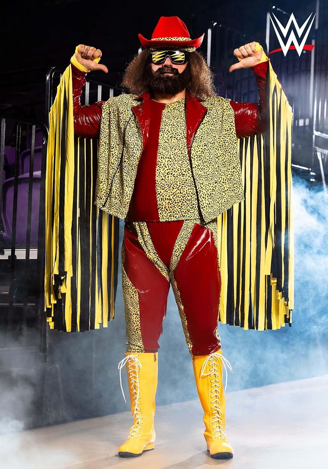 Randy Savage, aka The Macho Man, is one of the most iconic WWE performers of the 80s. So, we're happy to announce that we've teamed up with the WWE to produce this officially licensed Randy Savage Costume. Created by us in our very own Made by Us costume studios, we studied vintage WWE videos to recreate his iconic red vinyl and leopard print suit. The quality and signature style of this costume will have you feeling like one of the all-time greatest legends of the ring. “OH YEAH!” This Macho Man Costume starts with vinyl pants and a sleeveless pullover shirt. The pants fit with an elastic waistband and a matching jacket fits over the shirt. The jacket secures in the front with a front separating zipper, and each sleeve has extra-long black and yellow fabric fringe strips attached to recreate his famous style. Fabric hand wraps will give you a ring-ready look, and the matching felt cowboy hat completes the style.