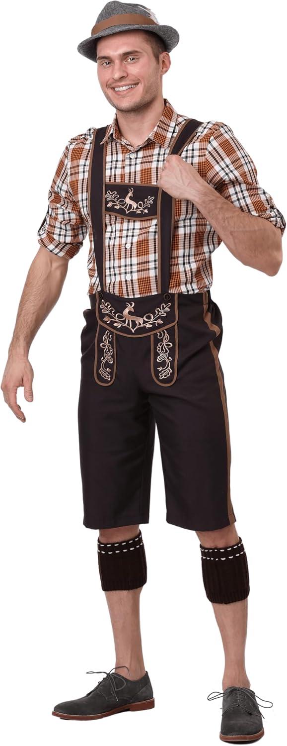 Men’s Oktoberfest Stud Costume, Brown Lederhosen Beer Festival Outfit, Bavarian Dress Up with Hat