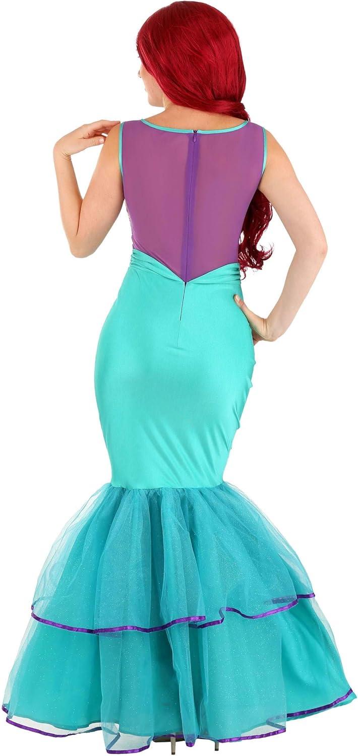 Are you looking to turn heads at the next office party? Then you have to check out our Shell-a-brate Mermaid Women's Costume. We made it ourselves! The sleeveless mermaid costume features a purple stretch mesh top with mermaid scale spandex, a spandex seashell bra attached across the front, and a pastel teal and purple color scheme with a zipper down the center back. The turquoise green spandex skirt has glitter tulle on the bottom hem. You'll be the best dressed on land or in the ocean! – Dress