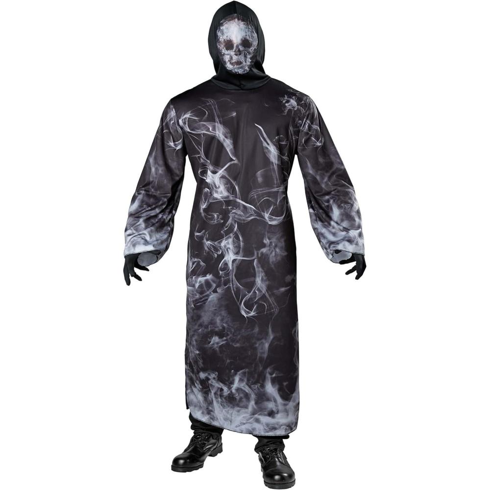 Misty Spirit Adult Hooded Robe Costume – Skull Mesh Face Cover, Wide Sleeves, Printed Swirling Mist Design