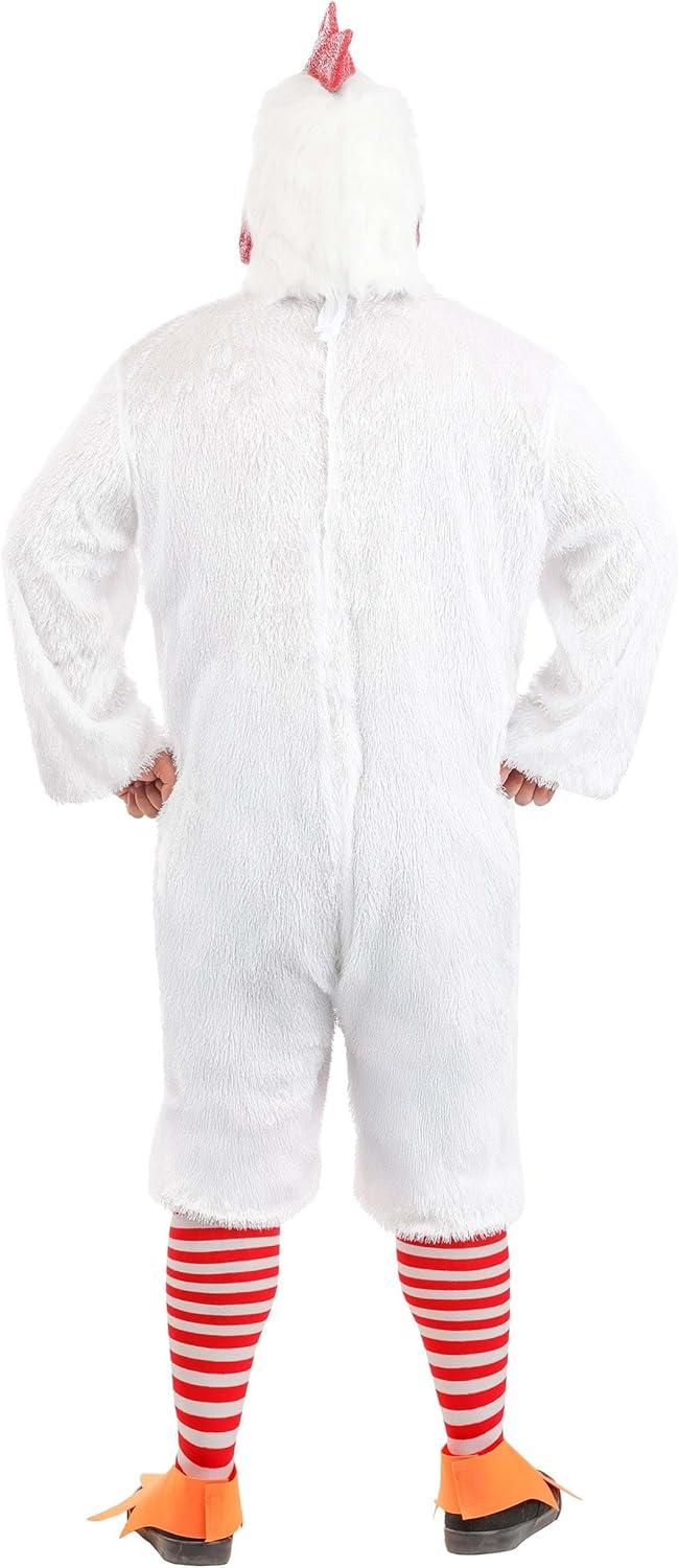 Cock-a-doodle-doo in style with this Plus Size Rooster Costume that’s ready to rule the barnyard—or the costume party! This cluck-tastic ensemble includes a white faux-feathered polyester jumpsuit with a back fastener for easy wear. It’s roomy, comfy, and perfect for strutting your stuff from sunup to sundown. Whether you're leading the farm or cracking jokes at a party, this costume is sure to ruffle a few feathers in the best way. The full-head rooster mask brings the whole look together with molded details, bright colors, and faux fur that adds bold texture and farmyard flair. Red-and-white striped stockings and oversized orange shoe covers shaped like chicken feet complete the outfit with barnyard accuracy. Ideal for Halloween, parades, plays, or themed events, this costume is a hilarious and crowd-pleasing way to bring your inner rooster to life. – Jumpsuit – Full Head Mask – Pair of Stockings – Pair of Shoe Covers