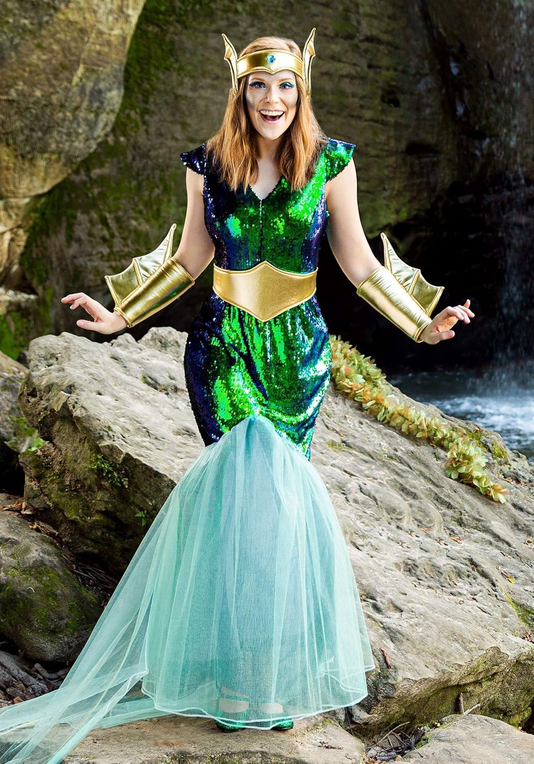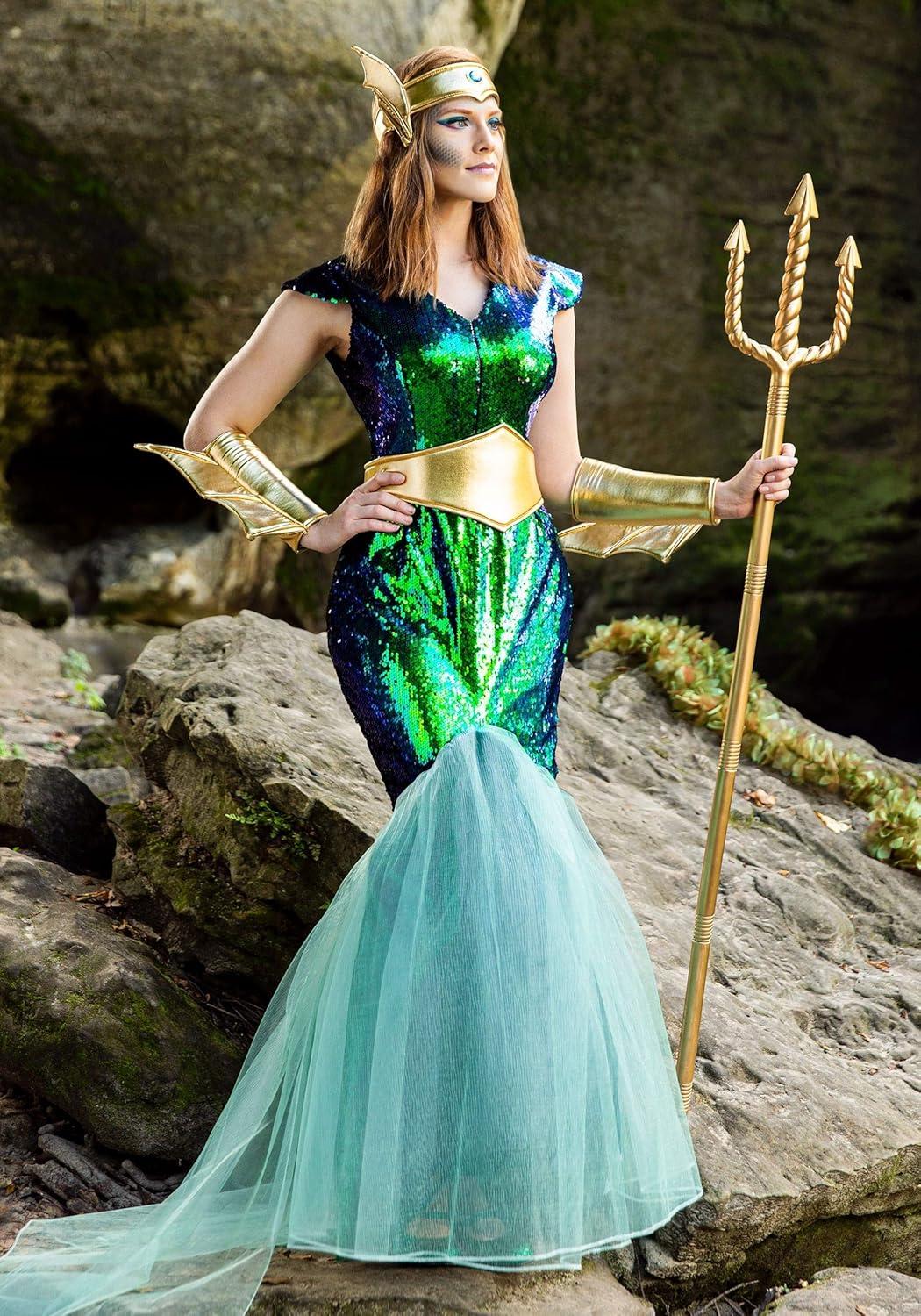 Queen Of The Sea Sirens Costume for Women, Mermaid Queen Outfit With Iridescent Dress, Belt, Crown, And Pair Of Wrist cuffs(Bundle W/ Trident)