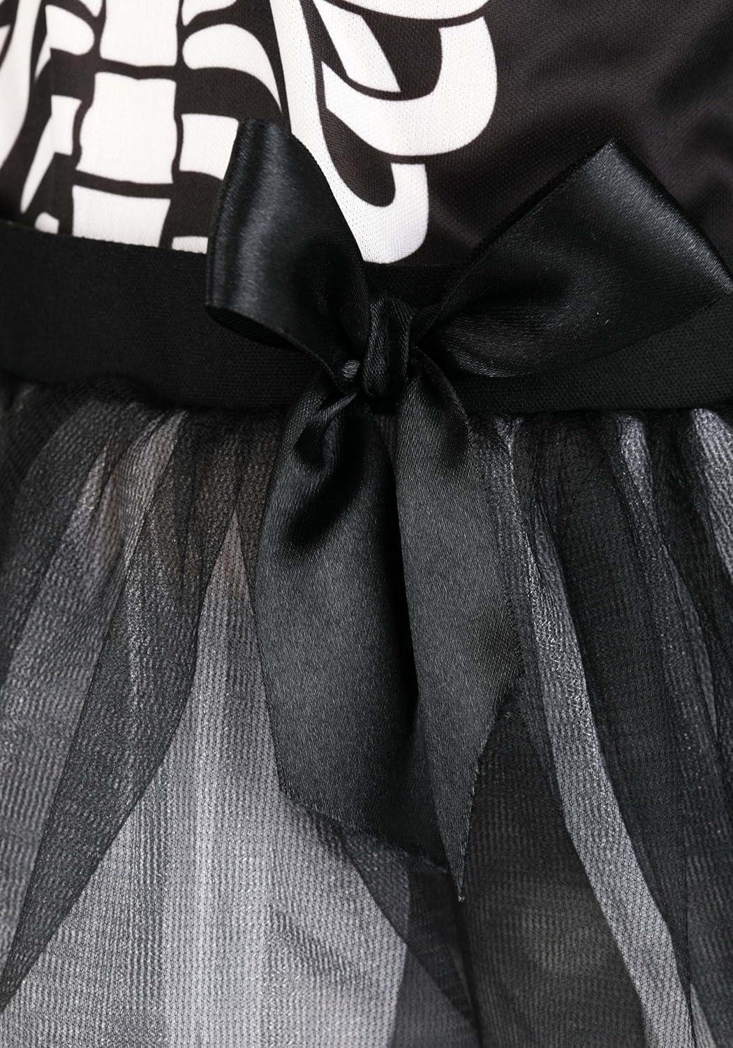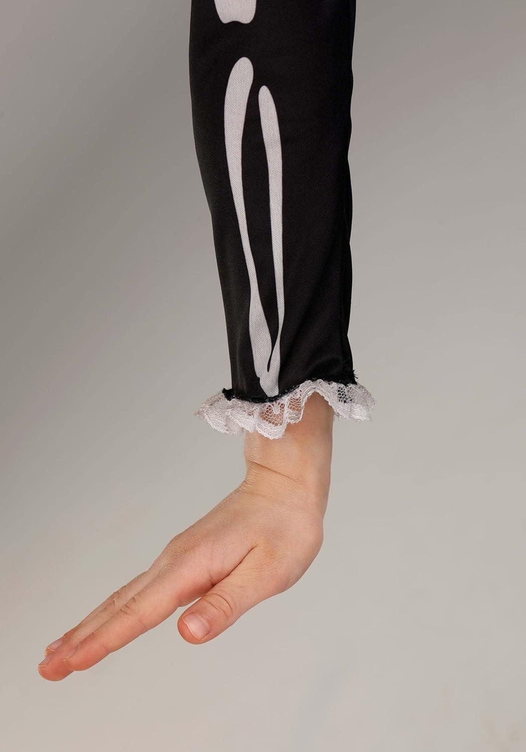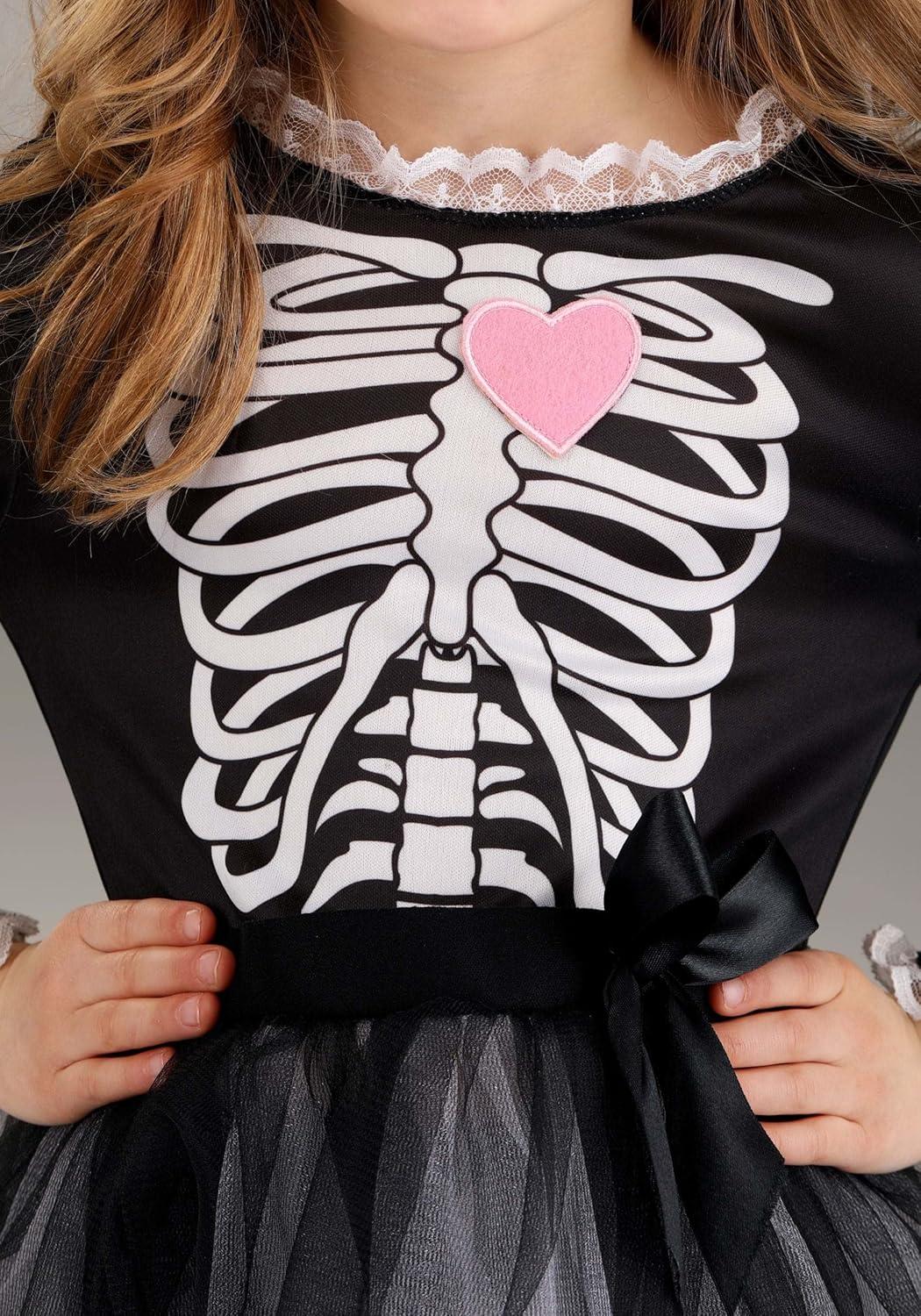 Let your kid be bad to the bone this Halloween with our exclusive Skeleton Dress Costume for Kids, made by us! The jersey knit dress has a hook and loop fastener at the center back, while the jersey knit bodice has printed bones and lace edging at the neck and sleeve cuffs. An appliqued pink felt heart is on the left front below the neckline, while the skirt is layered mesh below the sewn-in ribbon waist sash. Leggings have elastic waistbands and printed bones on the front.