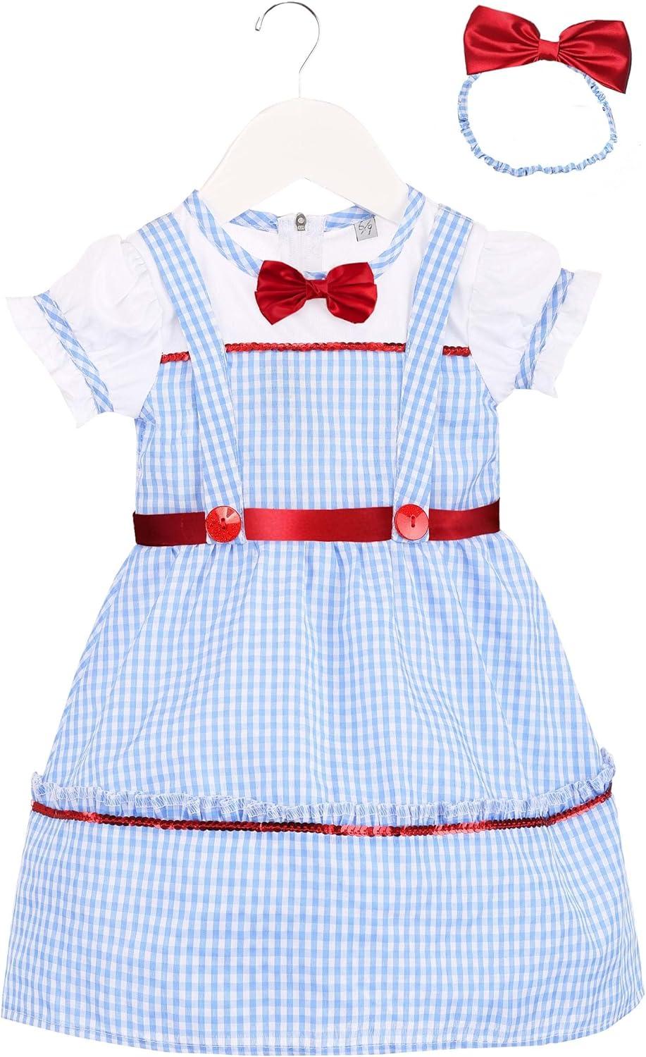 Sweet Kansas Girl Costume For Babies, Infant Farm Girl Outfit With Blue Gingham Dress And Headband With A Ruby Red Bow