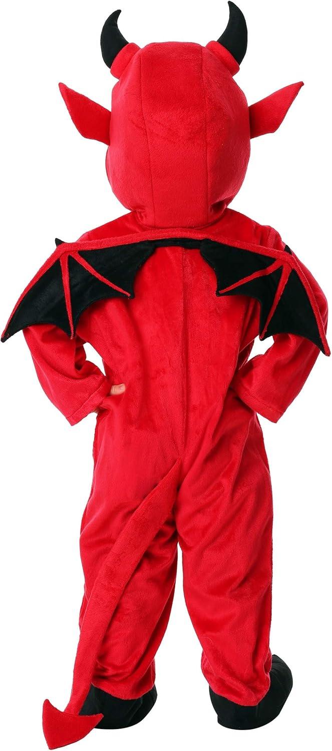 The Fun Costumes Adorable Devil Costume for Toddlers This adorable devil costume will let your tot bring a little fire and brimstone to Halloween! Zip your little one up in the soft, red black-winged jumpsuit to give them the impish look of a tiny little demon. The jumpsuit also includes a pointed tail, blush black hooves on the feet, and a stand-out hood. The hood has a pointed, widow's peak cut, side ears, and black horns. While your little one might not be an angel, your child will definitely be welcome by all saints and sinners this Halloween! Product Details: 100% polyester velour fabric Front zipper Feet are fully enclosed with hoof-shaped toes Tail sewn to back of suit Wings sewn to back of shoulders have wire in top edge for shape Hood has soft-sculpted ears & horns on top Size Chart: 2T: Chest=29″; Sleeve Length=13″; Torso=18″; Inseam=10 1/2″; Jumpsuit Length=28″ 4T: Chest=32″; Sleeve Length=13 3/4″; Torso=20″; Inseam=12 1/2″; Jumpsuit Length=31″ About Us: Fun Costumes are exclusively made by us and begin with passion, teamwork, and industry expertise decades in the making. Our products are proof that with the right people even a simple idea can grow into something incredible. We started in a small garage in Minnesota, providing costumes to our local community, and now we're creating costumes for people all around the world. – Jumpsuit With Attached Tail and Wings
