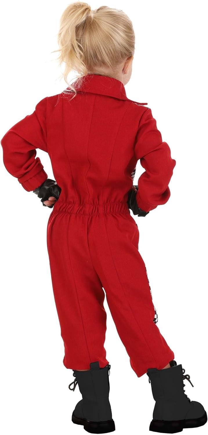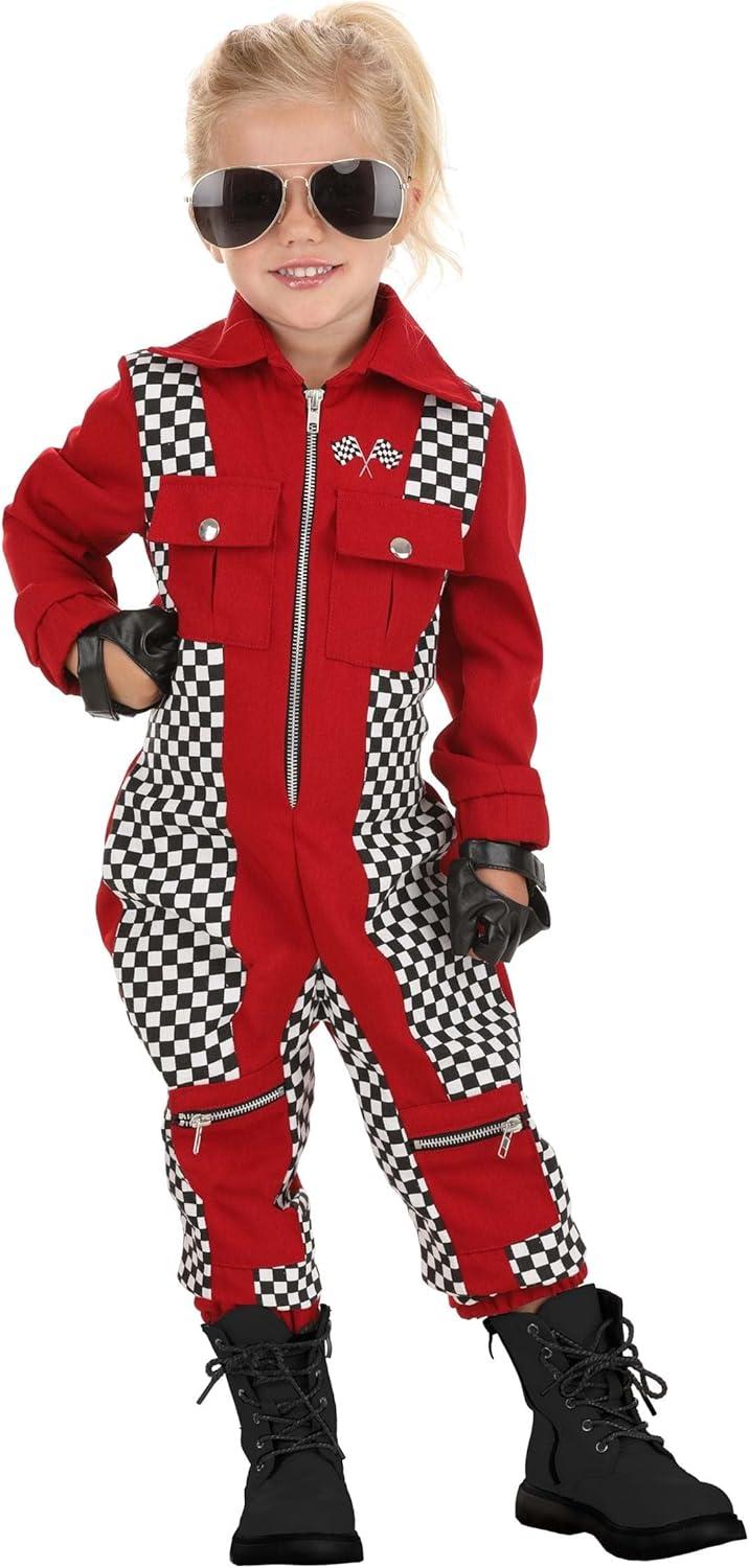 Toddler Red Racer Jumpsuit For Girls, Race Car Driver Costume With Red Jumpsuit And Checkered Panels With Faux Leather Gloves