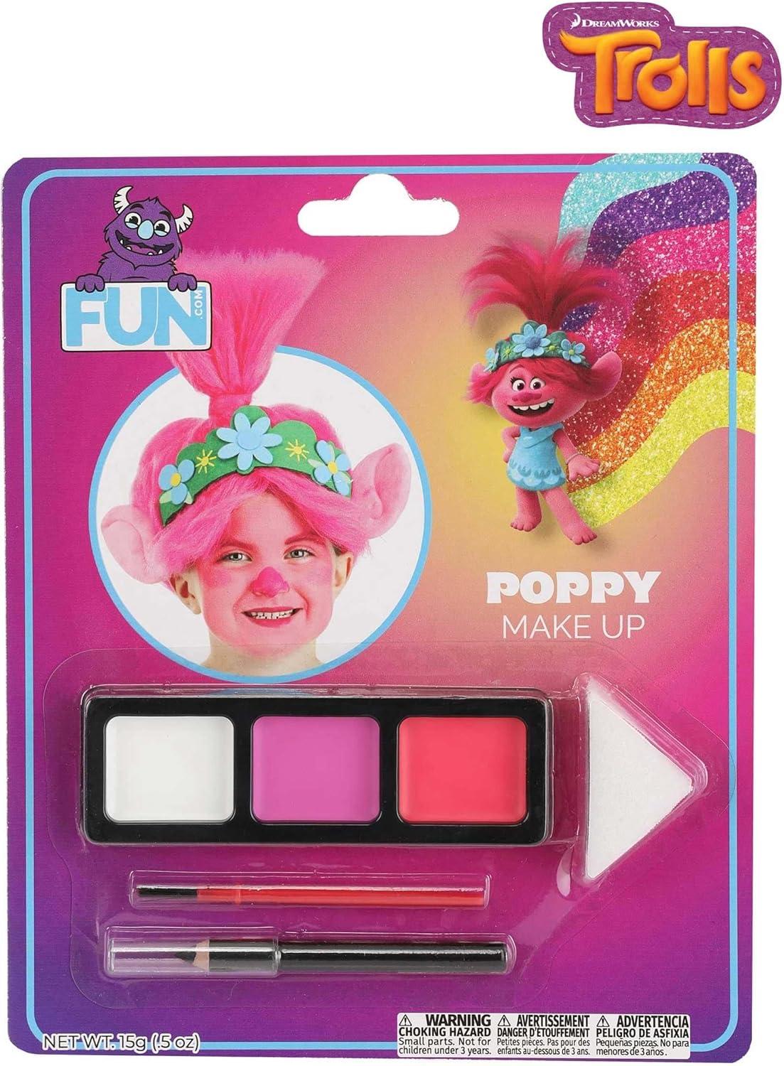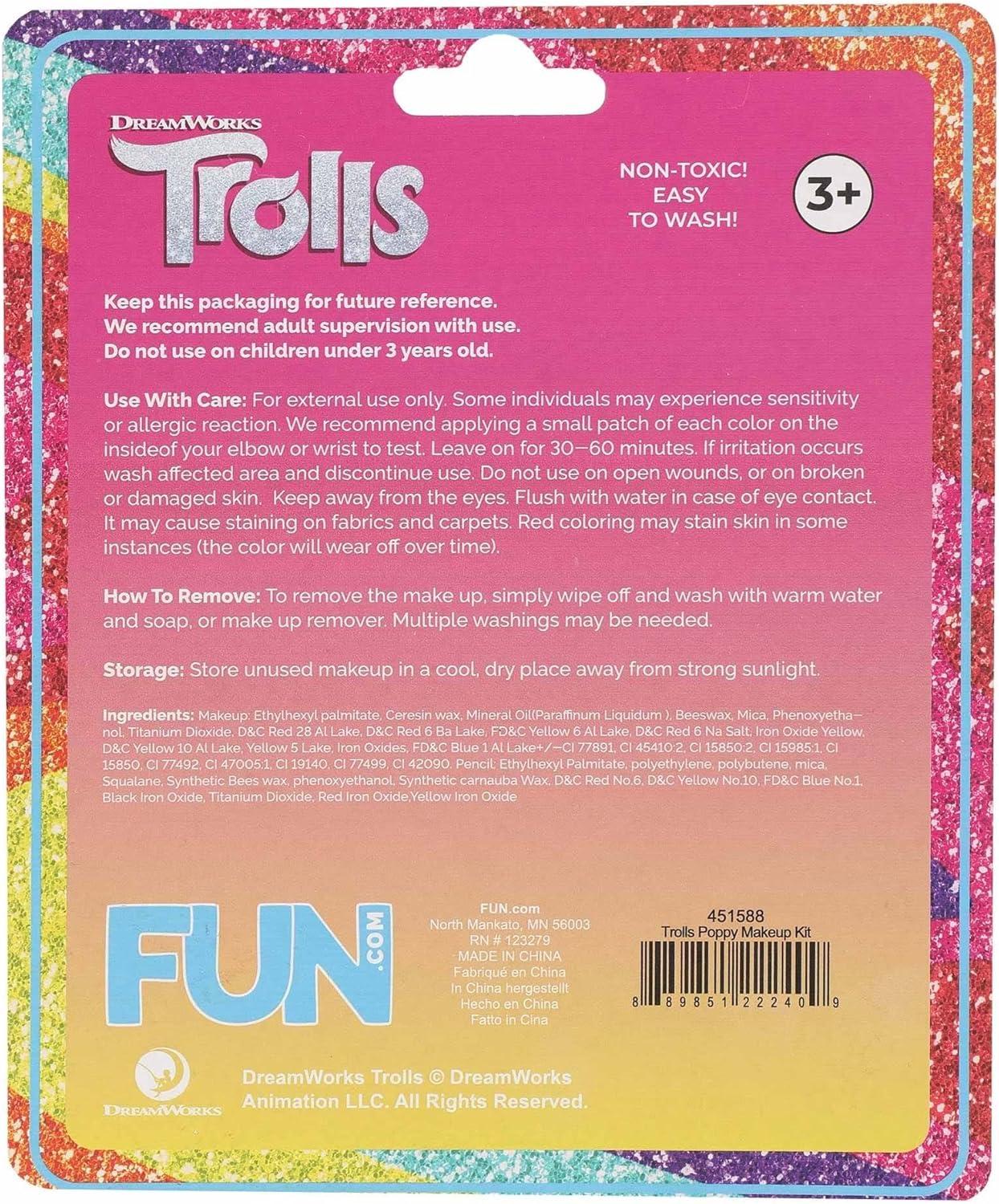 Introducing the Officially Licensed Trolls Poppy Costume Makeup Kit Transform into your favorite Trolls character with our Trolls Poppy Costume Makeup Kit! Get ready for hours of imaginative play and costume fun as you embrace the vibrant world of Poppy with this specially designed makeup kit. Our kit includes high-quality, vibrant cream makeup that effortlessly brings Poppy's signature look to life. The creamy texture ensures smooth and easy application, allowing you to achieve Poppy's iconic appearance with ease. Safety is our top priority. Rest assured that our makeup is non-toxic and gentle on young skin. Parents can enjoy peace of mind while their children explore their creative side. And when the adventure is over, cleanup is a breeze – simply wash off with soap and water. Worried about how to remove the makeup once the festivities are done? Worry not! We've included step-by-step removal instructions on the back of the package, making cleanup hassle-free and ensuring a worry-free experience. This makeup kit is designed with young Trolls fans in mind. It's suitable for ages 3 and up, making it perfect for birthday parties, dress-up playdates, or any occasion where a touch of Trolls magic is needed. You can trust that our Trolls Poppy Costume Makeup Kit is officially licensed, guaranteeing an authentic and true-to-character experience. Poppy herself would approve! Whether it's for Halloween, a Trolls-themed birthday party, or just a day of imaginative play, our Trolls Poppy Costume Makeup Kit is the perfect choice to bring the enchanting world of Trolls to life. Join Poppy and her friends on adventures filled with glitter, color, and positivity, and let your creativity shine! Embrace the magic of Trolls with confidence, knowing that our makeup kit is safe, easy to use, and officially licensed. Order yours today and get ready to paint the town – or your face – with the colors of happiness! – Make-up Tray – Sponge – Brush – Pencil