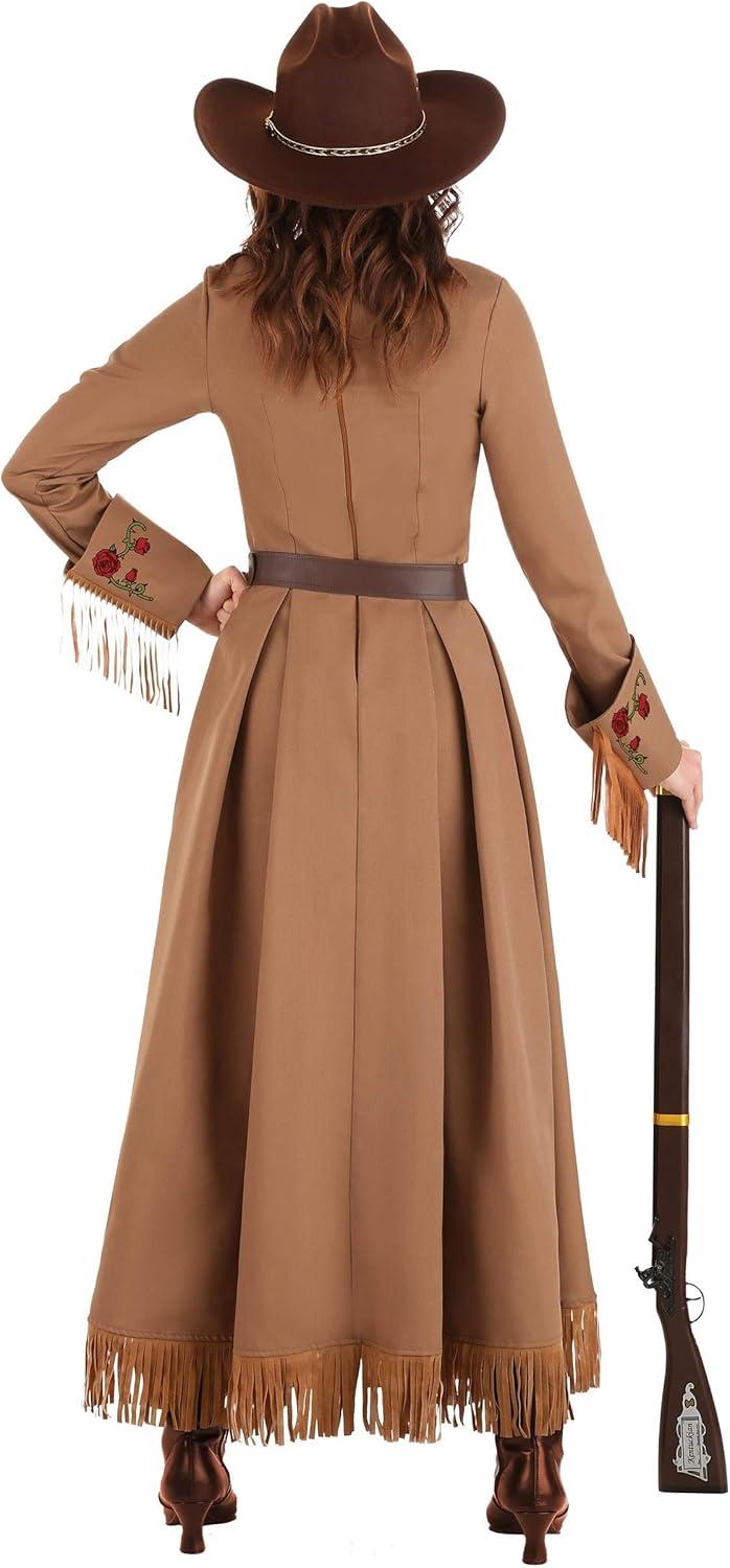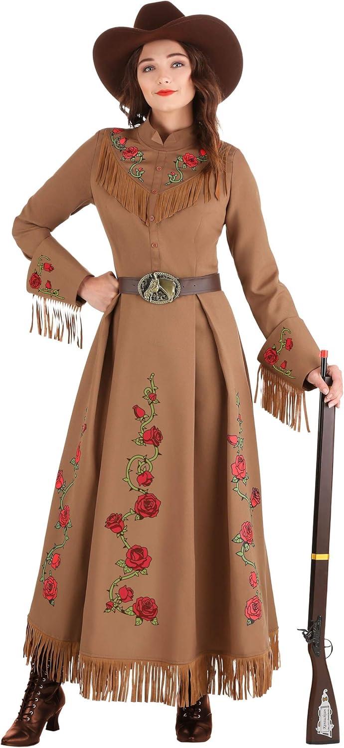 Annie Oakley Costume for Adults: Nothing says “Giddy Up!” like our Women’s Annie Oakley Costume! Let the wild west come alive this Halloween with this iconic ensemble. Dressed just like Miss Oakley in the 1880s, each costume features a light brown dress adorned with printed rose embellishments and attached suede fringe. The included belt has a metal buckle for extra detail and is sure to set off your cowgirl look. Show everyone you’re an ace sharpshooter when Halloween rolls around in our beautiful historical take on Miss Annie Oakley. Featuring a head-turning floral print on the bodice front, sleeve cuffs, and skirt, this 100% polyester dress is the perfect combination of feminine charm and sure shot accuracy. Soft faux suede fringe edging at the hemline, wrists and collar give it an added extra boost of wild western attitude. To help you really complete the look, a faux leather belt with metal buckle wraps around your waist for an authentically Wild West feel. With a back zipper for easy removal this costume is easy to wear, and with proper care you can wear it again and again for wild west roleplay! Product Details: 100% polyester costume Dress has back zipper, decorative buttons on front Faux suede fringe edging at the hemline, wrists and collar Floral print on the bodice front, sleeve cuffs, & skirt Faux leather belt has metal buckle Size Chart: S: Chest=34″; Sleeve Length=24″; Waist=29″; Dress Length=55″ M: Chest=36″; Sleeve Length=24″; Waist=31″; Dress Length=55 1/2″ L: Chest=39″; Sleeve Length=24″; Waist=33 1/2″; Dress Length=57 1/2″ XL: Chest=42 1/2″; Sleeve Length=24″; Waist=36 3/4″; Dress Length=57 1/2″ About Us: Fun Costumes are exclusively made by us and begin with passion, teamwork, and industry expertise decades in the making. Our products are proof that with the right people even a simple idea can grow into something incredible. We started in a small garage in Minnesota, providing costumes to our local community, and now we're creating costumes for p