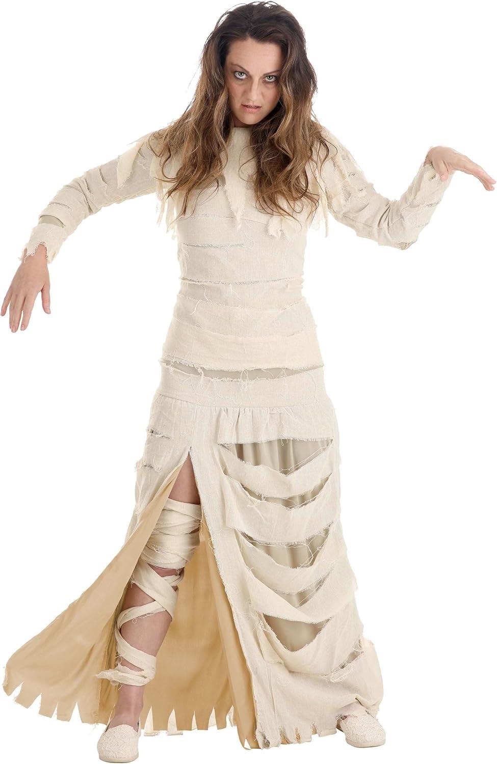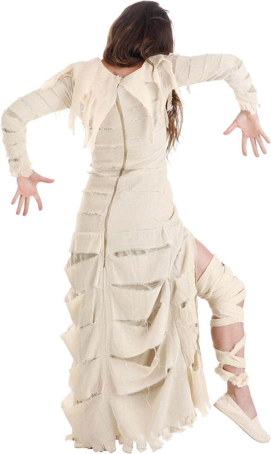 The Fun Costumes Full Length Mummy Costume Dress for Adults Classic mythological movie monsters are always going to be among our favorite memories. That's why we put so much care into creating Made by Us costumes inspired by them. We know that most of us will always remember the first time we were spooked or mesmerized by the idea of the Mummy's Curse, so we aim to help you live out those experiences with our classic Women's Full Length Mummy Dress. Product Design: To make sure you have the best time possible, our Bandaged Mummy costume was designed in our own studios to have a comfortable yet authentic feel. The Mummy dress features long sleeves, cheesecloth wrapping, and a high slit down the length of the skirt. The off-white of the dress and the wrapping creates a perfect mummified illusion while the leg wraps give a beautiful macabre accent. Product Details: 100% polyester interlock knit and cheesecloth Dress has back zipper, asymmetric neckline off the right shoulder Interlock knit base layer has overlaid strips of cheesecloth Thigh-high slit on right side of skirt Leg wraps are strips of cheesecloth; wrap & tie as desired Size Chart: S: Chest=34.5″; Waist=30.5”; Length (at slit)=30.5”; Whole Length=59″ M: Chest=37″; Waist=33”; Length (at slit)=31.5”; Whole Length=60″ L: Chest=39″; Waist=36”; Length (at slit)=32”; Whole Length=61″ XL: Chest=41.5″; Waist=38.5”; Length (at slit)=33”; Whole Length=61″ About Us: Fun Costumes are exclusively made by us and begin with passion, teamwork, and industry expertise decades in the making. Our products are proof that with the right people even a simple idea can grow into something incredible. We started in a small garage in Minnesota, providing costumes to our local community, and now we’re creating costumes for people all around the world! Women's mummy costumes aren't usually styled as dresses, but this fun Full Length Mummy Costume features the styling you want for spooky Halloween fun! – Dress – Pair of Leg Wraps
