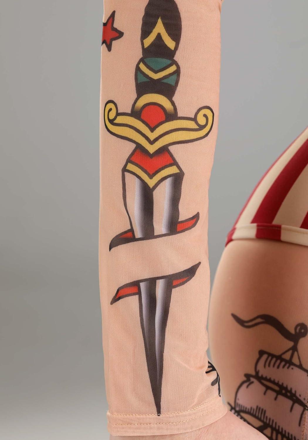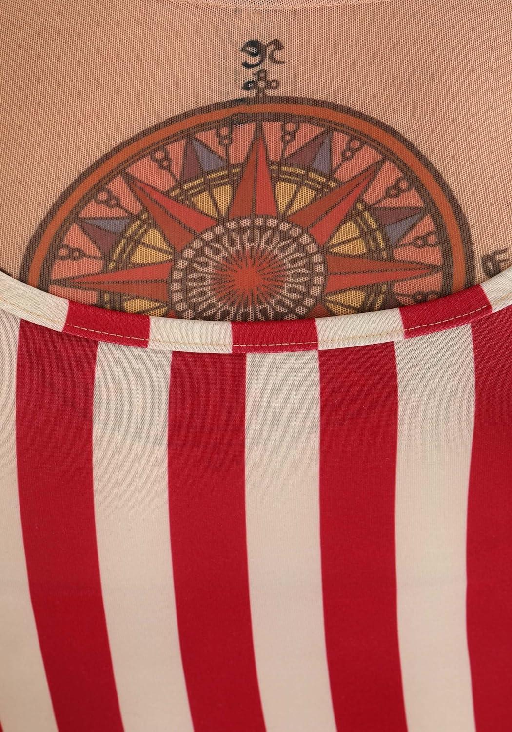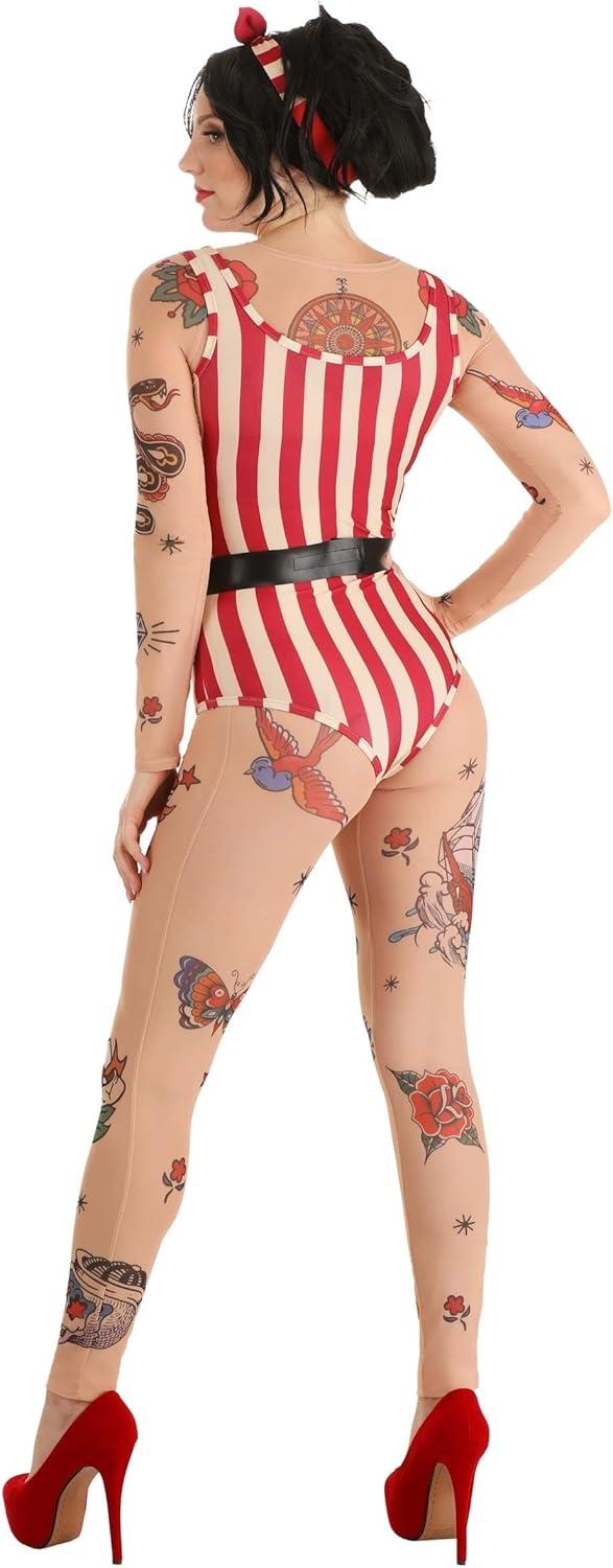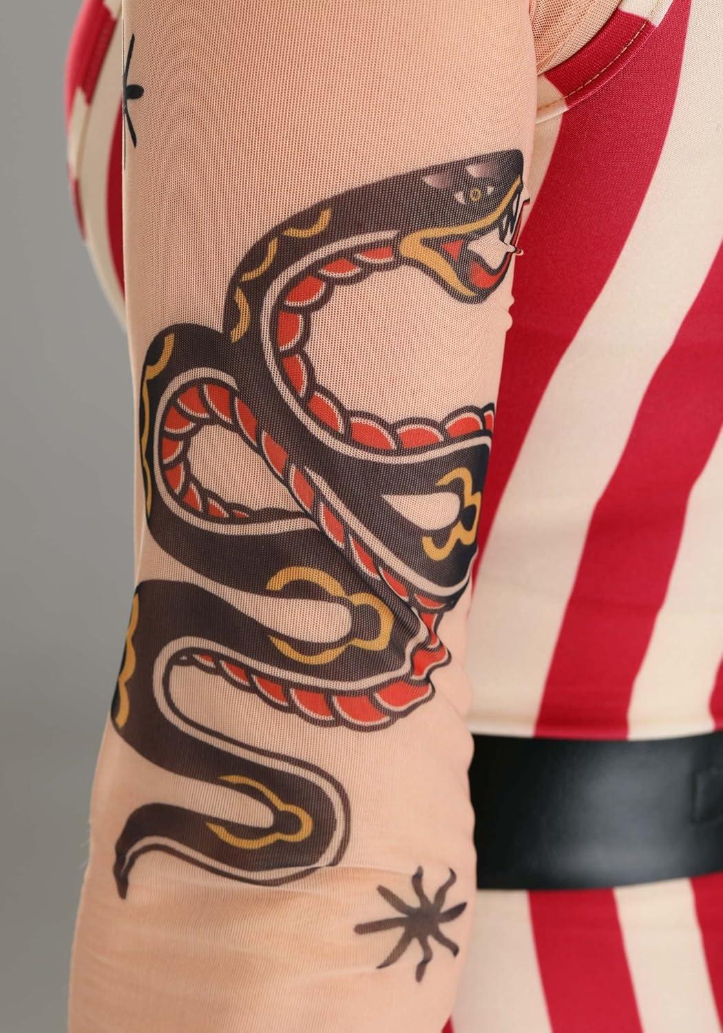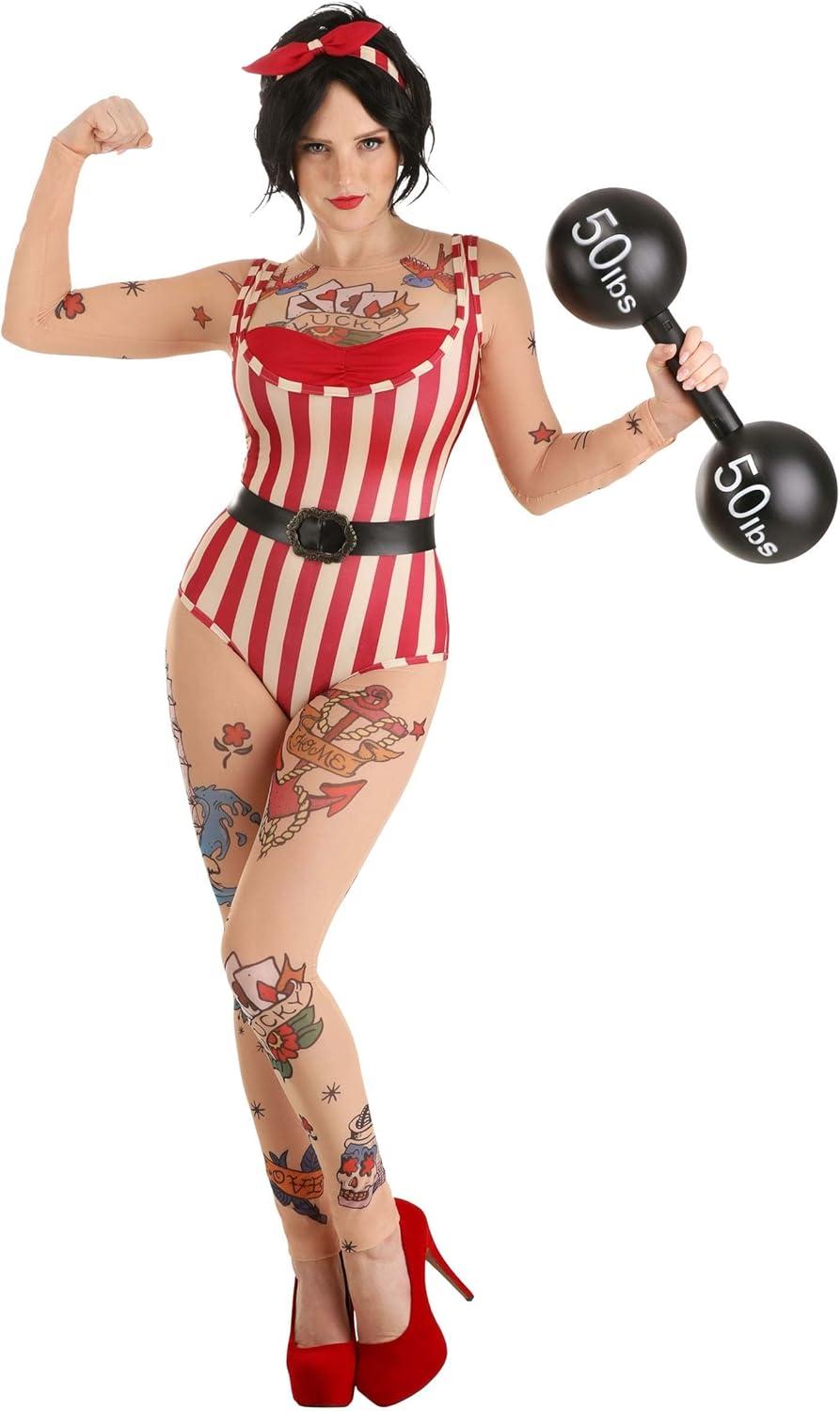 Fun Costumes Women's Vintage Strong Woman Circus Costume: The Women's Vintage Strong Woman Circus Costume is an excellent choice for women who want to stand out at any event. This complete costume set includes a shirt, leggings, bandeau, bodysuit, belt, and headband, creating an authentic vintage look. The shirt and leggings are made of 85% polyester and 15% spandex sheer mesh fabric, while the bodysuit is made of 96% polyester and 4% spandex. The bandeau is made of 100% polyester jersey knit, with ruching at the center front. The long-sleeved pullover mesh shirt features printed tattoo graphics on the front, back, and sleeves, while the mesh leggings have an elastic waistband and printed tattoo graphics on both legs. The step-in striped bodysuit adds an extra touch of authenticity, and the faux leather belt has a hook and loop fastener at the back and a decorative antique brass-tone metal buckle at the front. The striped fabric headband completes the look with a fabric bow at the front and an elastic band at the back. With this Women's Vintage Strong Woman Circus Costume, you'll be the star of any event! Product Details: Shirt and leggings are made of 85% polyester, 15% spandex sheer mesh fabric Bodysuit is made of 96% polyester, 4% spandex Bandeau is 100% polyester jersey knit Long-sleeved pullover mesh shirt has printed tattoo graphics on front, back, and sleeves Mesh leggings have elastic waistband and printed tattoo graphics on both legs Bandeau top has rouching at center front Step-in striped bodysuit Faux leather belt has hook and loop fastener at back, decorative antique-brass-tone metal buckle at front Striped fabric headband has fabric bow at front, elastic band at back Barbell shown in photo is sold separately Size Chart: XS: Shirt/Bra Chest=26″; Sleeve Length=23 1/2″; Shirt Length=19 1/2″; Bodysuit Chest=27″; Bodysuit Waist=22″; Torso=26 1/4″; Leggings Waist=24″ – 33″; Inseam=29″ S: Shirt/Bra Chest=28″; Sleeve Length=23 3/4″; Shirt Length=20″;