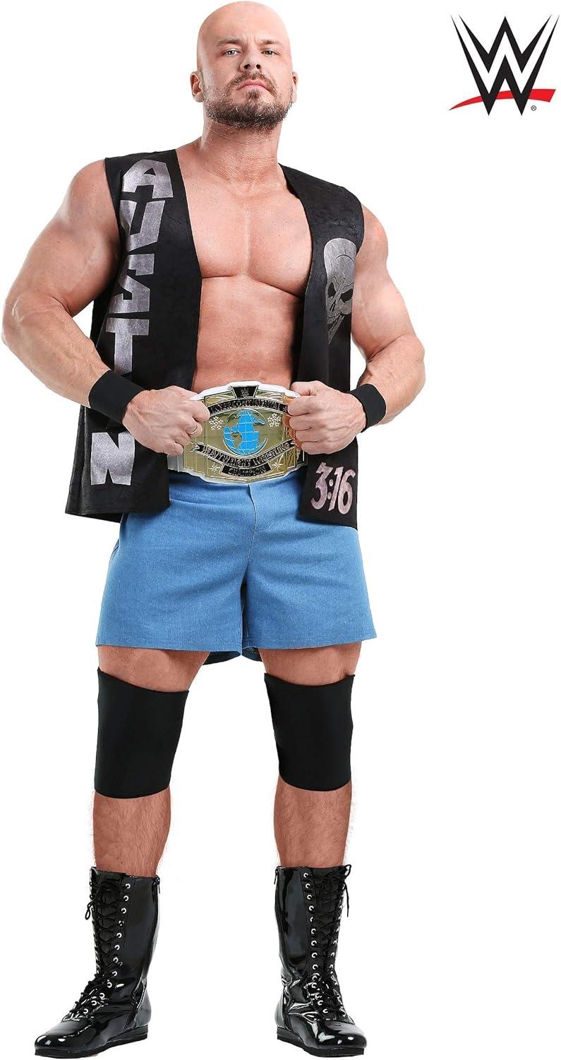 Raise some hell and live the Attitude Era with the WWE Stone Cold Steve Austin Men's Costume, an officially licensed outfit designed to transform you into the baddest man in sports entertainment. Whether you're dressing up for Halloween, hosting a WWE watch party, entering a cosplay contest, or channeling your inner rebel at a wrestling convention, this costume lets you relive the energy of a true wrestling legend. The centerpiece of the costume is the iconic black faux suede vest, featuring the bold white “AUSTIN 3:16” on one side and a skull graphic on the other—just like Stone Cold wore during his legendary walkouts and in-ring promos. This attention-grabbing vest is lightweight and easy to layer over your own tee or wear shirtless for that full Stone Cold effect. Paired with the vest are denim-inspired blue shorts, designed with an elastic waistband in the back for a comfortable fit and easy wear. The false fly adds a realistic look without compromising comfort. These shorts keep the rugged style alive while letting you move freely—whether you’re in the ring or on the dance floor. To complete the transformation, the costume includes a pair of black elastic wristbands that slide on for a snug fit, and a pair of foam knee pads that fasten securely with hook and loop straps. Each piece is crafted to echo the look of Stone Cold during his most iconic matches and entrances. This adult men's costume is available in Small through 2X-Large, ensuring a great fit for wrestling fans of all sizes. It's a must-have for WWE fans, group costumes, Attitude Era throwbacks, or anyone ready to crack open a can of whoop-ass. Please note: goatee not included, but the attitude is all yours.